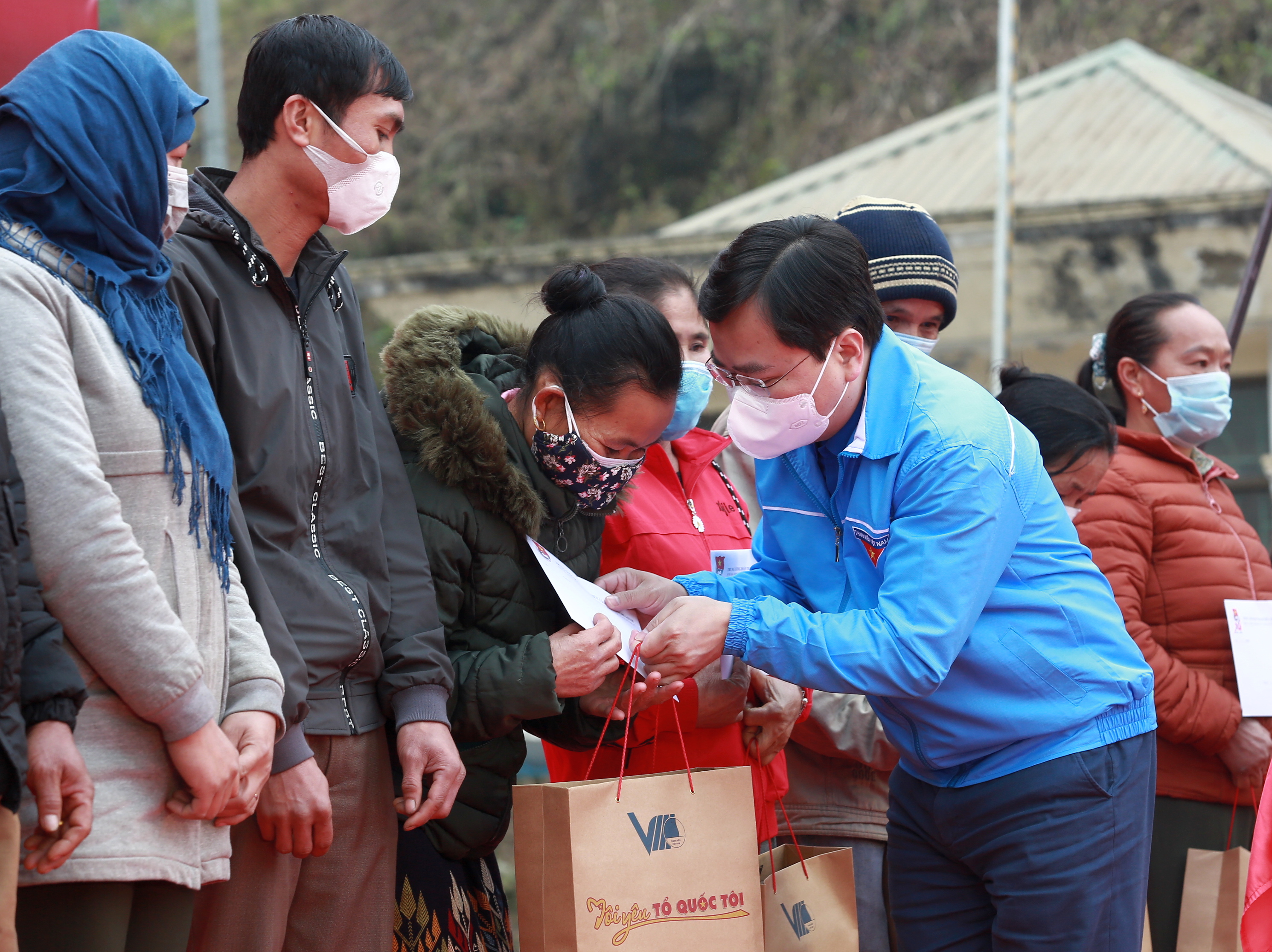 Đồng chí Nguyễn Anh Tuấn, Bí thư thứ nhất TƯ Đoàn tặng quà cho các gia đinh chính sách, gia đình TNXP, người có uy tín trong đồng bào dân tộc