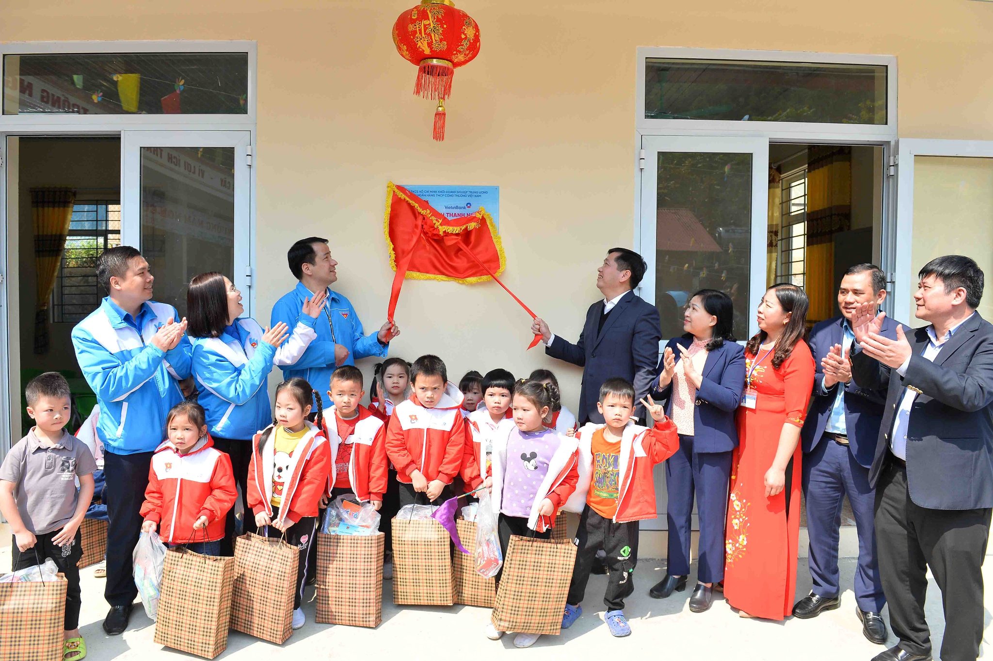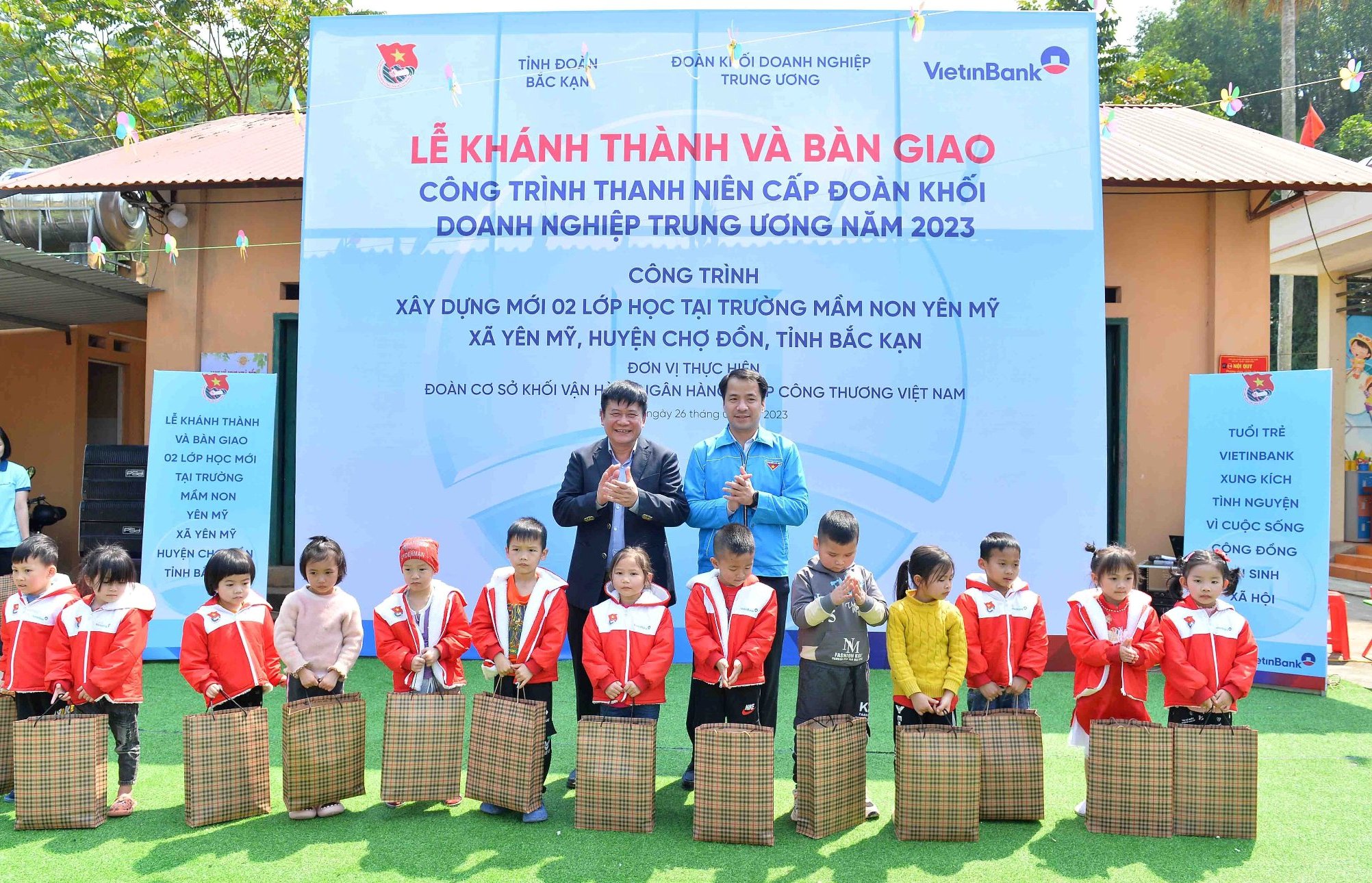 Bí thư Trung ương Đoàn Ngô Văn Cương và lãnh đạo Ngân hàng Vietinbank trao tặng quà cho các em học sinh Trường mầm nonYên Mỹ, xã Yên Mỹ, huyện Chợ Đồn