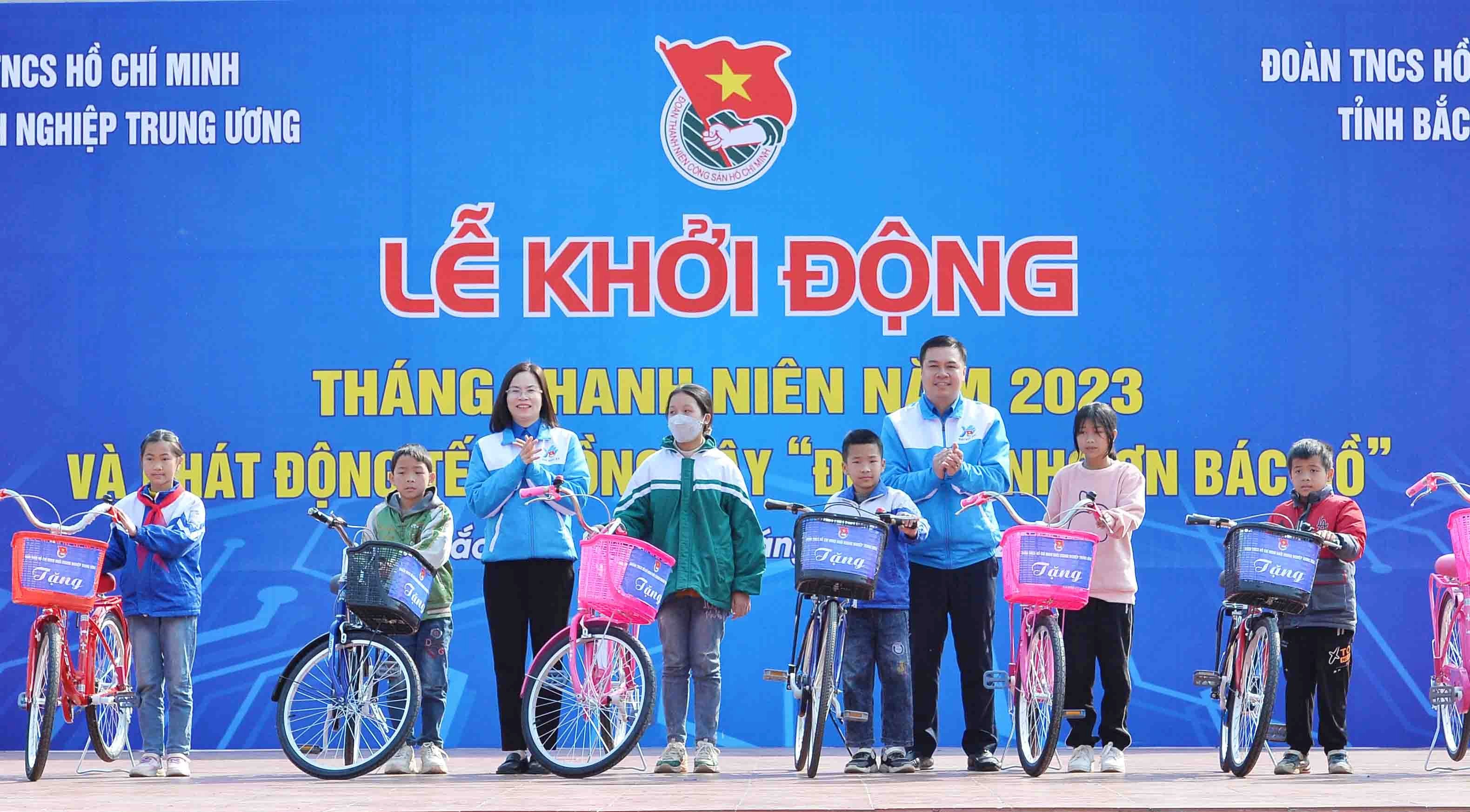 Bí thư Đoàn Khối Doanh nghiệp Trung ương Hoàng Thị Minh Thu và Bí thư Tỉnh Đoàn Bắc Kạn Triệu Tiến Trình trao tặng xe đạp cho các em học sinh nghèo vượt khó tại huyện Chợ Đồn