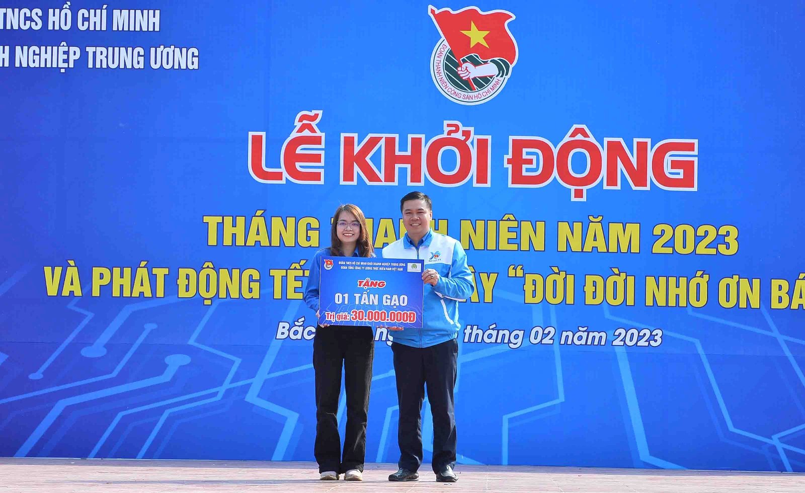 Đồng chí Lê Mai Hân, Bí thư Đoàn Tổng công ty Lương thực miền Nam (bìa trái) trao biển tượng trưng hỗ trợ 01 tấn gạo, trị giá 30 triệu đồng