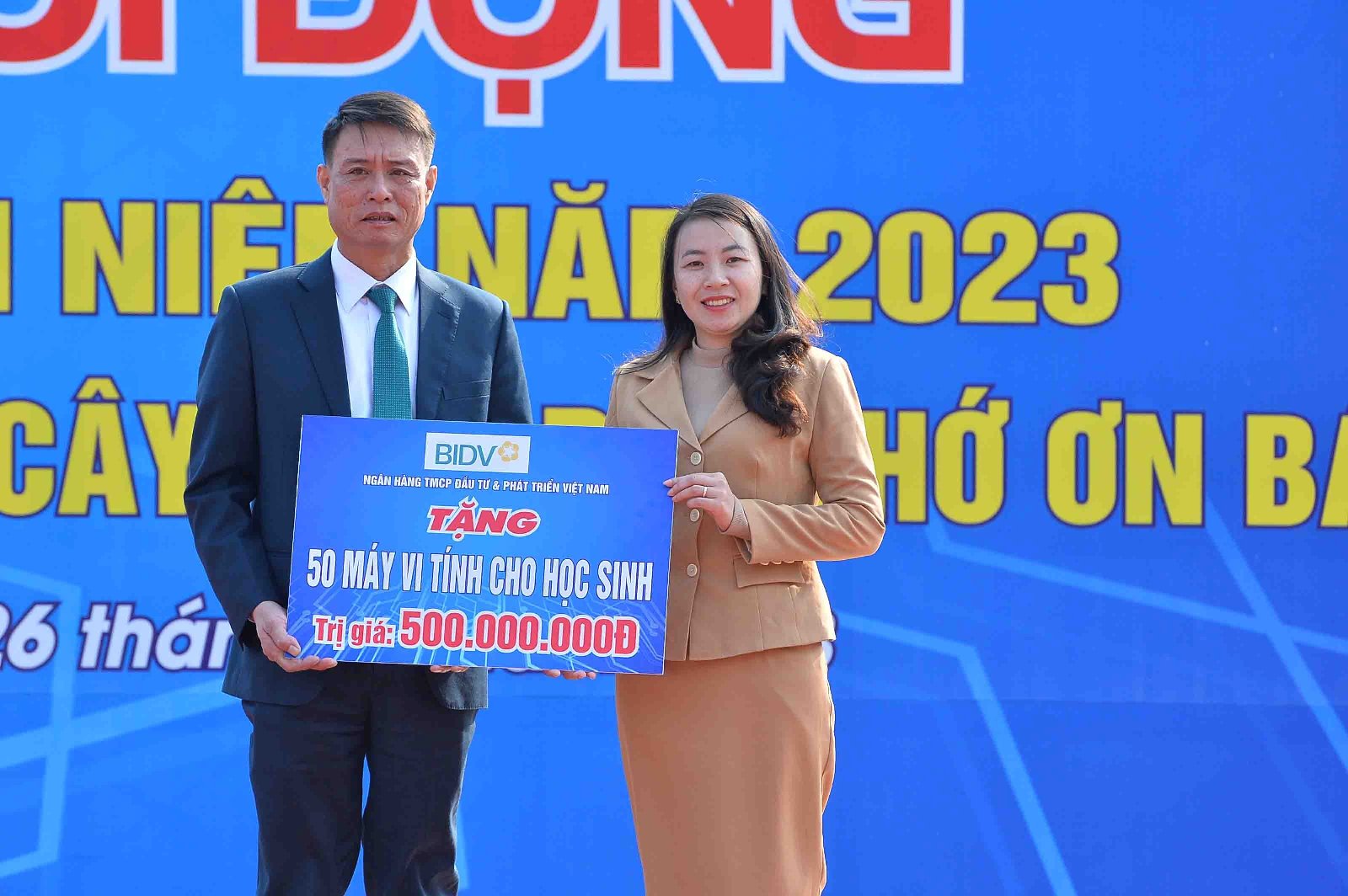 Đại diện Ngân hàng Thương mại cổ phần Đầu tư và Phát triển Việt Nam trao biển tượng trưng tặng 50 bộ máy tính cho các em học sinh tỉnh Bắc Kạn trị giá 500 triệu đồng