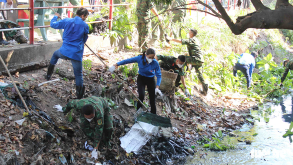 Các bạn trẻ cùng dọn dẹp kênh rạch trong Tháng thanh niên 2022 - Ảnh: Q.LINH