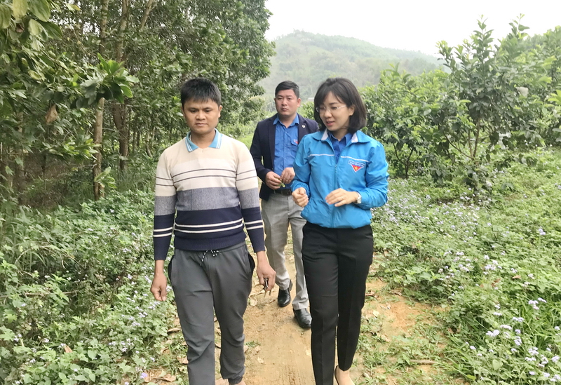 Chị Phạm Thị Bích Hường, Bí thư Thành đoàn thăm mô hình trồng cây ăn quả của đoàn viên Nguyễn Văn Sáng, thôn 20 xã Kim Phú