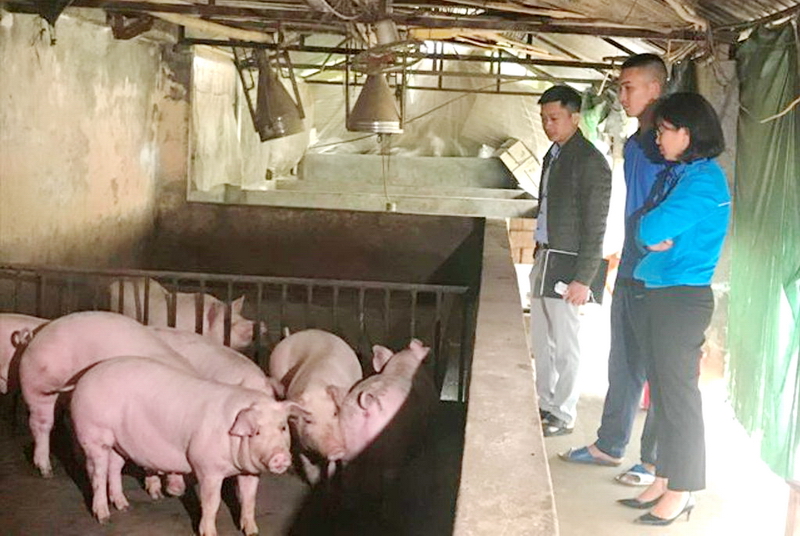 Chị Phạm Thị Bích Hường, Bí thư Thành đoàn thăm mô hình nuôi lợn của đoàn viên Đặng Việt Dũng, tổ 2, Phường Mỹ Lâm