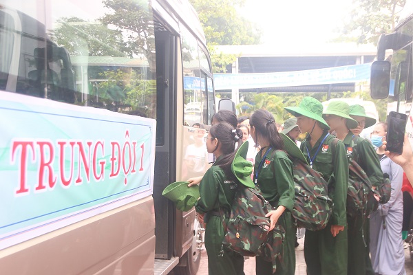 Các chiến sĩ nhí lên xe tham gia “Học kỳ trong quân đội”.