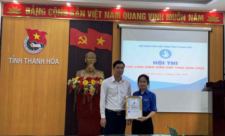 Đồng chí Nguyễn Hữu Tuất - Phó Bí thư Tỉnh đoàn, Chủ tịch Hội sinh viên Việt Nam tỉnh Thanh Hóa trao Giải Nhất cho Phạm Nhật Ánh - sinh viên Trường ĐH Văn hóa, Thể thao và Du lịch Thanh Hóa