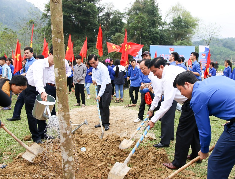 Các đại biểu và ĐVTN tham gia trồng cây sau Lễ phát động
