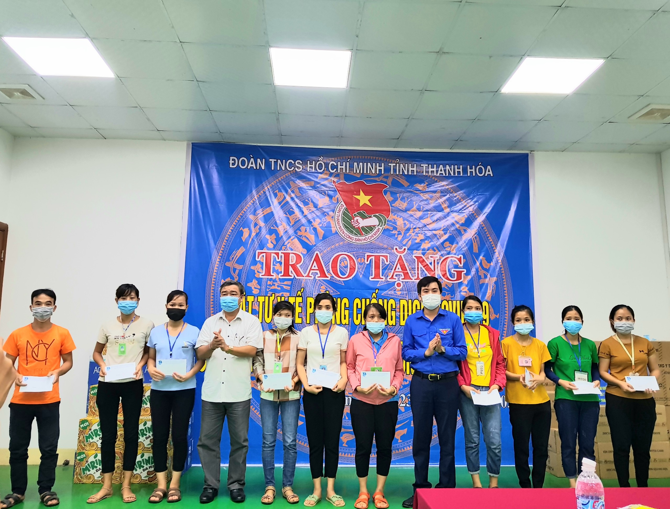 Bí thư Tỉnh đoàn Thanh Hóa Lê Văn Châu trao tặng khẩu trang, nước rửa tay sát khuẩn phòng chống Covid-19 cho thanh niên công nhân công ty TNHH giầy Alena Việt Nam tại xã Định Liên