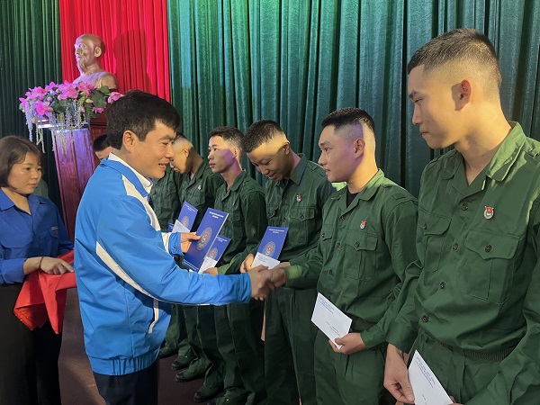 Đồng chí Lê Văn Châu,Ủy viên Ban Chấp hành Trung ương Đoàn, Tỉnh ủy viên, Bí thư Tỉnh đoàn tặng quà cho các tân binh chuẩn bị lên đường nhập ngũ năm 2025