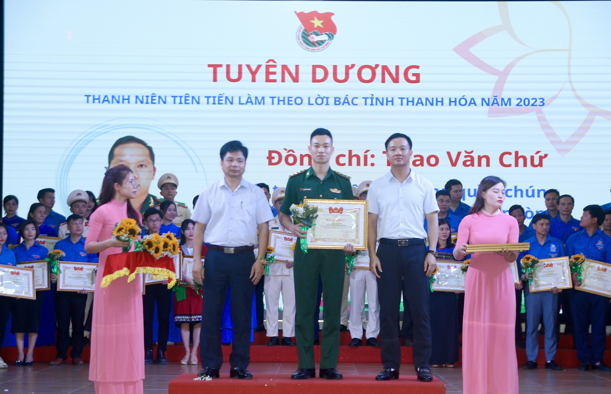 Đồng chí Lê Văn Châu, Tỉnh ủy viên, Bí thư Tỉnh Đoàn Thanh Hoá; TS. Lương Trọng Thành, Tỉnh uỷ viên, Hiệu trưởng Trường Chính trị tỉnh Thanh Hoá trao Bằng khen cho các thanh niên tiêu biểu