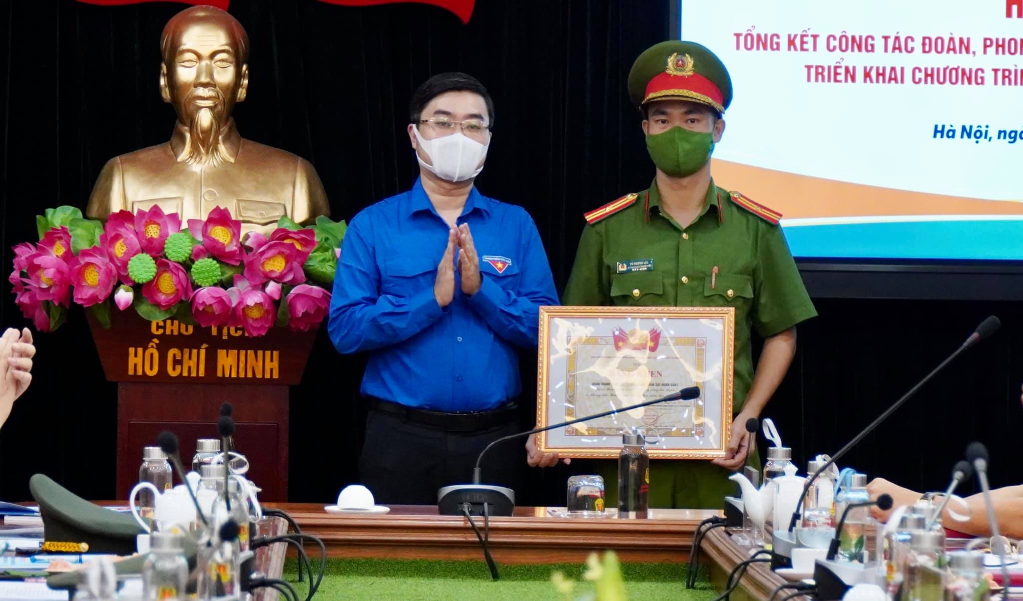 Trung tá Đồng Đức Vũ, Uỷ viên BTV Trung ương Đoàn, Bí thư Đoàn Thanh niên Bộ Công an trao Cờ của Đoàn Thanh niên Bộ Công an cho các tập thể có thành tích xuất sắc