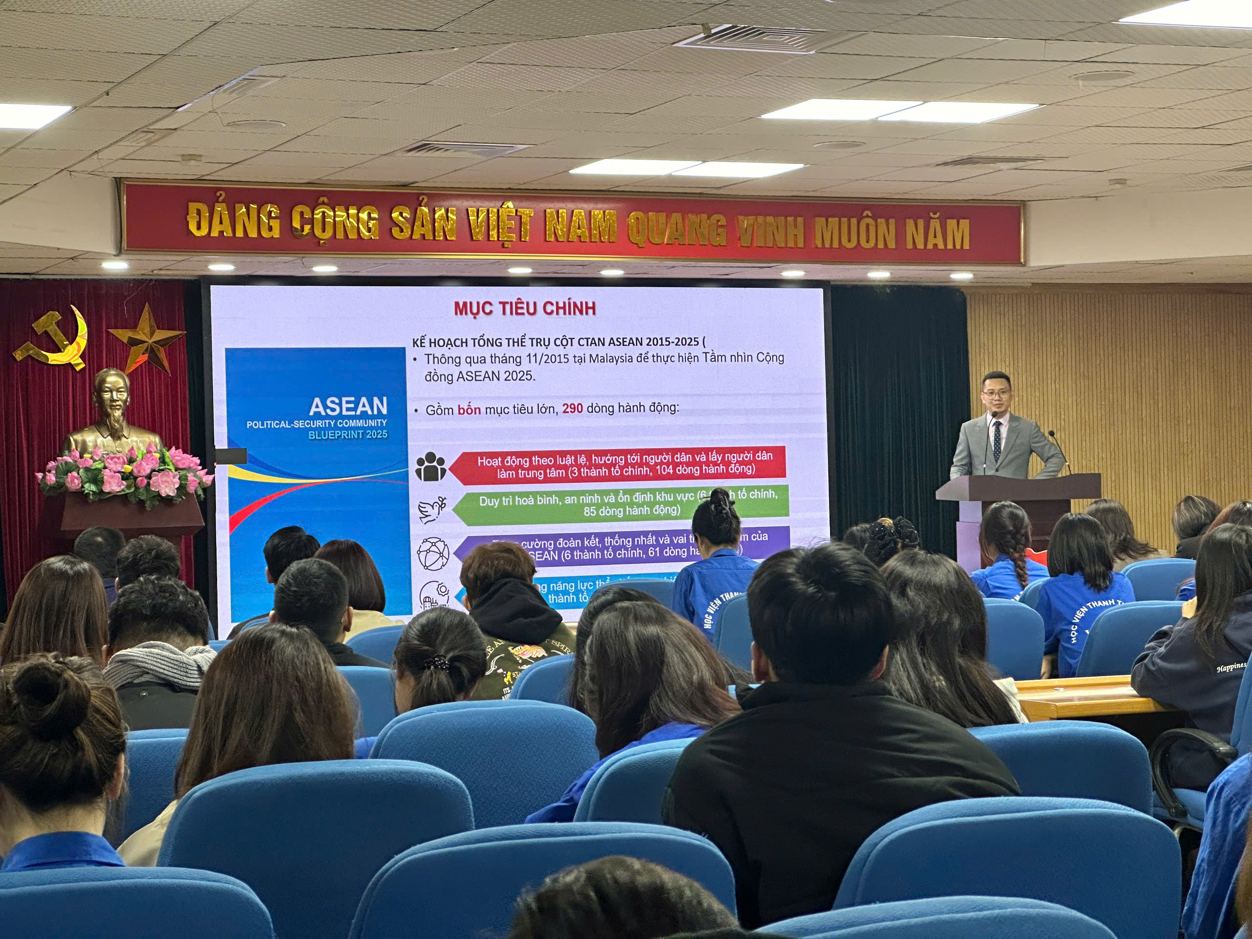 Đồng chí Ngô Tuấn Anh, Trưởng phòng Chính trị - An ninh, Vụ ASEAN, Bộ Ngoại giao trao đổi chuyên đề Hợp tác ASEAN trong Cộng đồng Chính trị - An ninh (APSC) với các bạn đoàn viên thanh niên tại hội thảo