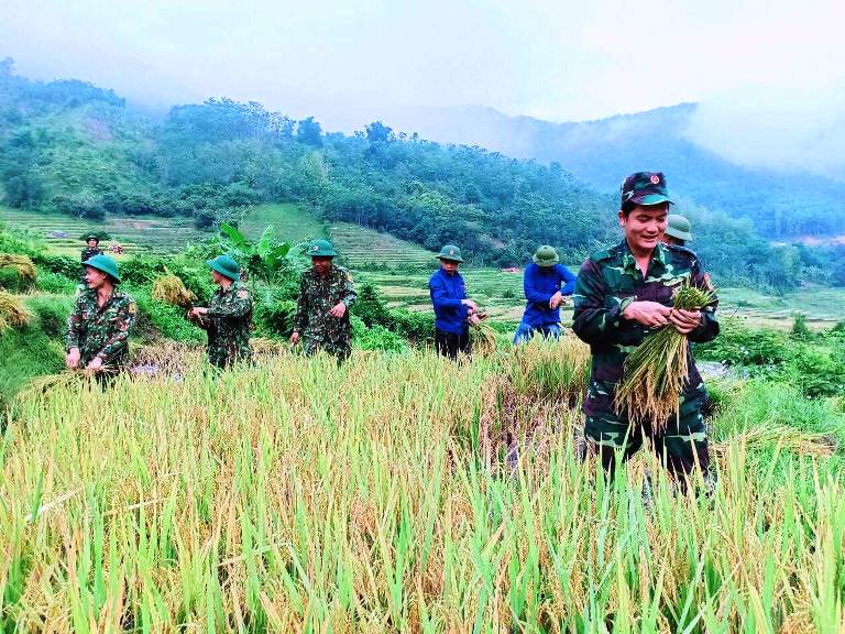 Dưới cái nắng hè gay gắt, các thanh niên phối hợp với lực lượng Biên phòng cửa khẩu Tén Tằn tập trung lực lượng giúp nhân dân thu hoạch nhanh gọn lúa chiêm xuân.