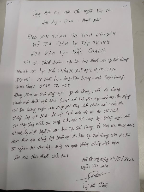 "Trước tình hình dịch bệnh Covid-19 diễn biến phức tạp, tiếp tục lan rộng, các lực lượng tuyến đầu đang phải gồng mình chiến đấu ngày đêm chống lại dịch bệnh. Là một thanh niên thế hệ Hồ Chí Minh, tôi nhận thấy mình cần xung kích, góp sức cùng lực lượng tuyến đầu chống lại dịch bệnh tại địa bàn Tỉnh Bắc Giang, vì vậy tôi muốn được tham gia phòng, chống dịch bệnh tại địa bàn Bắc Giang". Đó là những bày tỏ của tác giả trong lá đơn ngắn gọn nhưng thể hiện niềm khao khát được cống hiến, được góp sức trẻ của mình vào công cuộc bảo vệ sức khỏe nhân dân, thể hiện trách nhiệm với bản thân, gia đình, xã hội trước những diễn biến phức tạp của dịch bệnh.