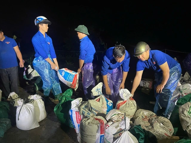 Cùng với việc hỗ trợ di chuyển người dân, lực lượng thanh niên tình nguyện của huyện Thường Tín đã thức trắng đêm để ứng trực, vận chuyển cát đến để be bờ đắp đập bảo đảm an toàn cho đê sông Hồng.