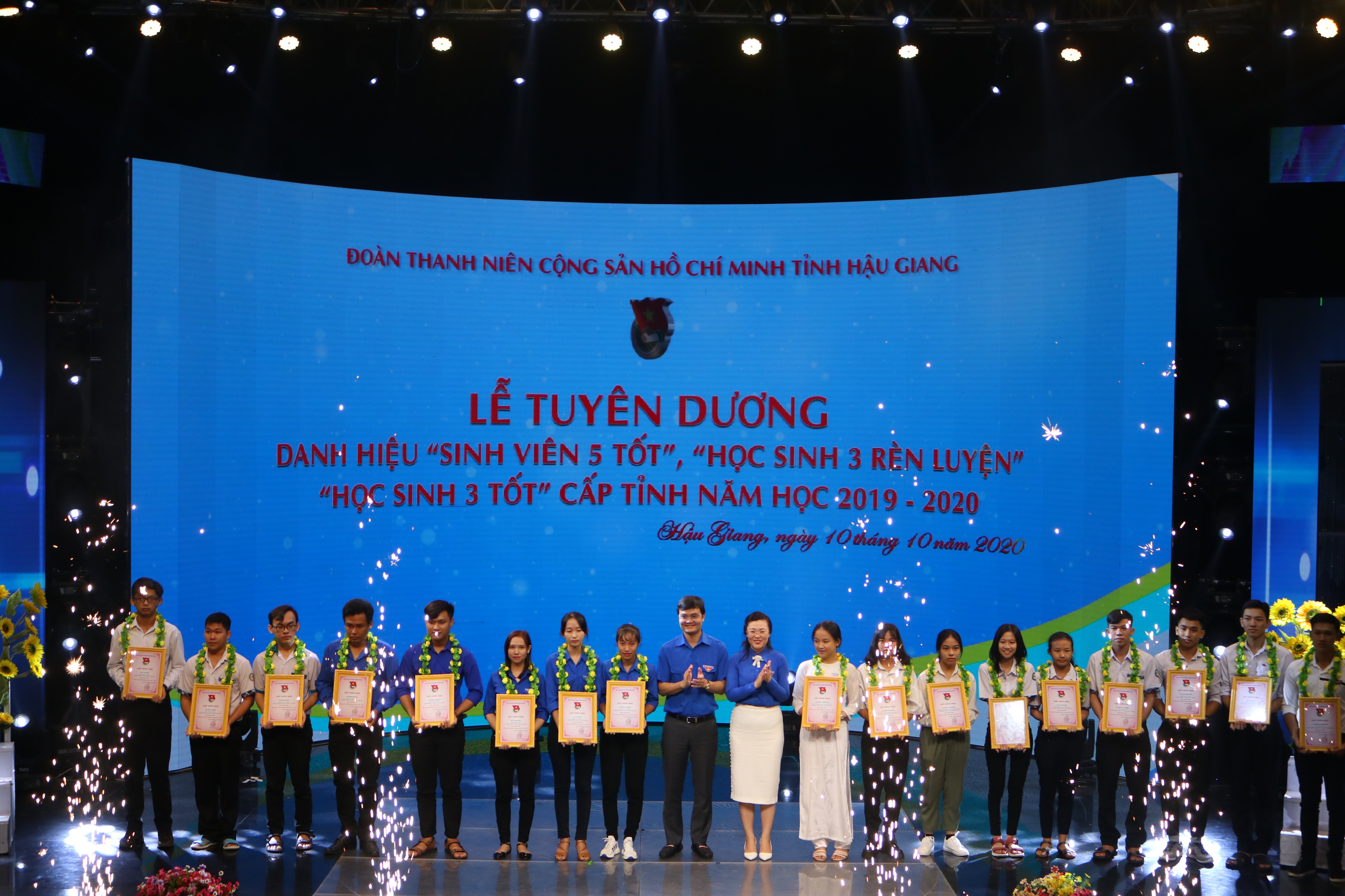 Đồng chí Bùi Quang Huy – Bí thư Trung ương Đoàn,Chủ tịch Hội SVVN và đồng chí Phạm Thị Thùy Dung - Bí thư Tỉnh đoàn trao giấy công nhận cho 50 gương thanh niên tiêu biểu trên các lĩnh vực năm 2020
