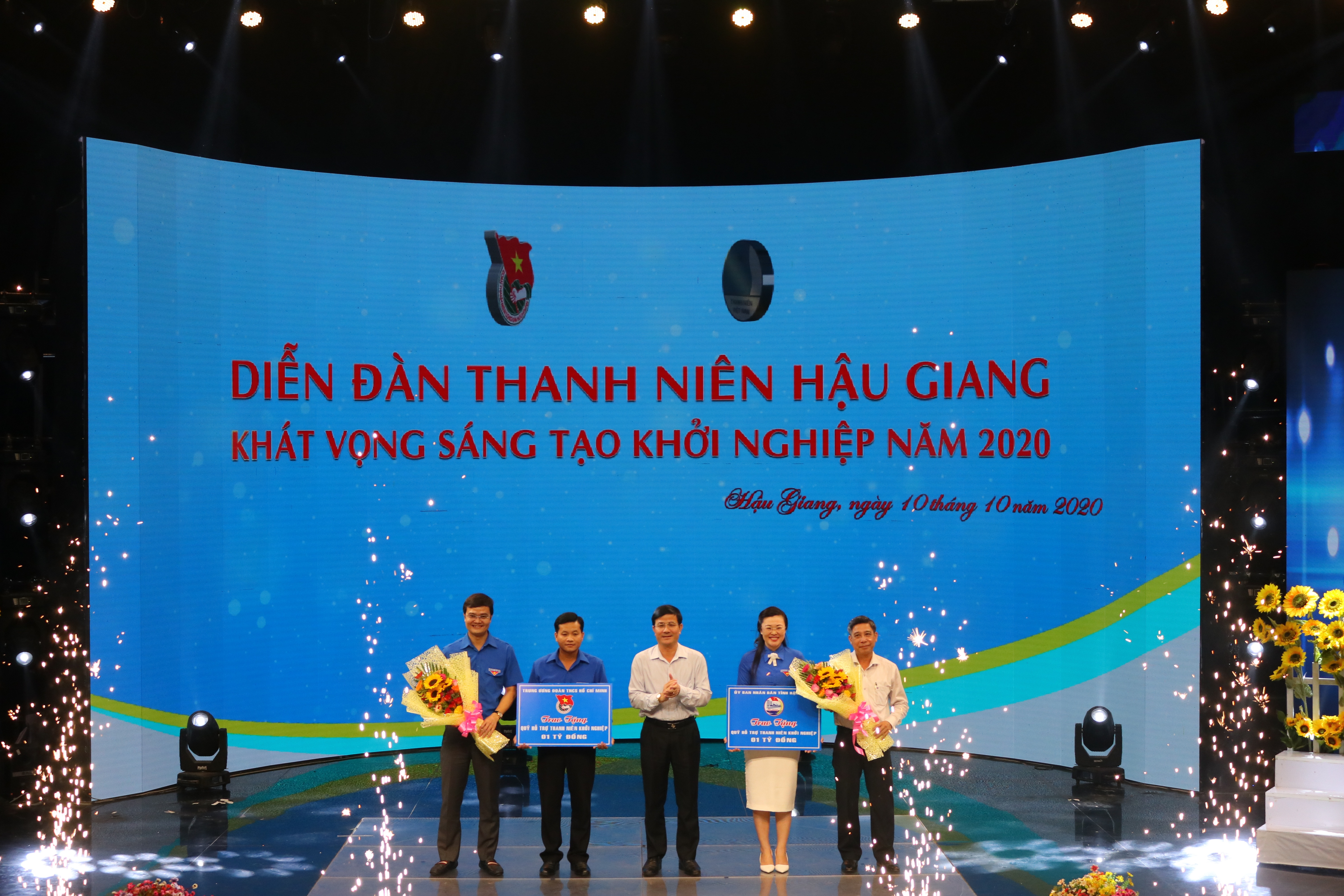 Đồng chí Bùi Quang Huy – Bí thư Trung ương Đoàn cùng lãnh đạo tỉnh trao bảng tượng trưng 01 tỷ đồng nguồn vốn 120 và Ủy ban nhân dân tỉnh trao 01 tỷ đồng vào quỹ khởi nghiệp cho thanh niên Hậu Giang