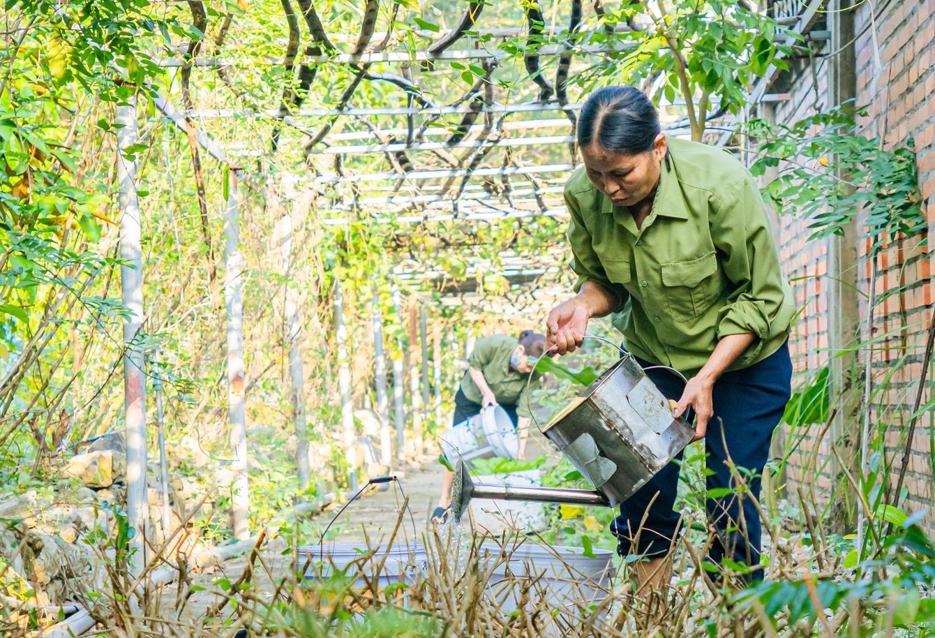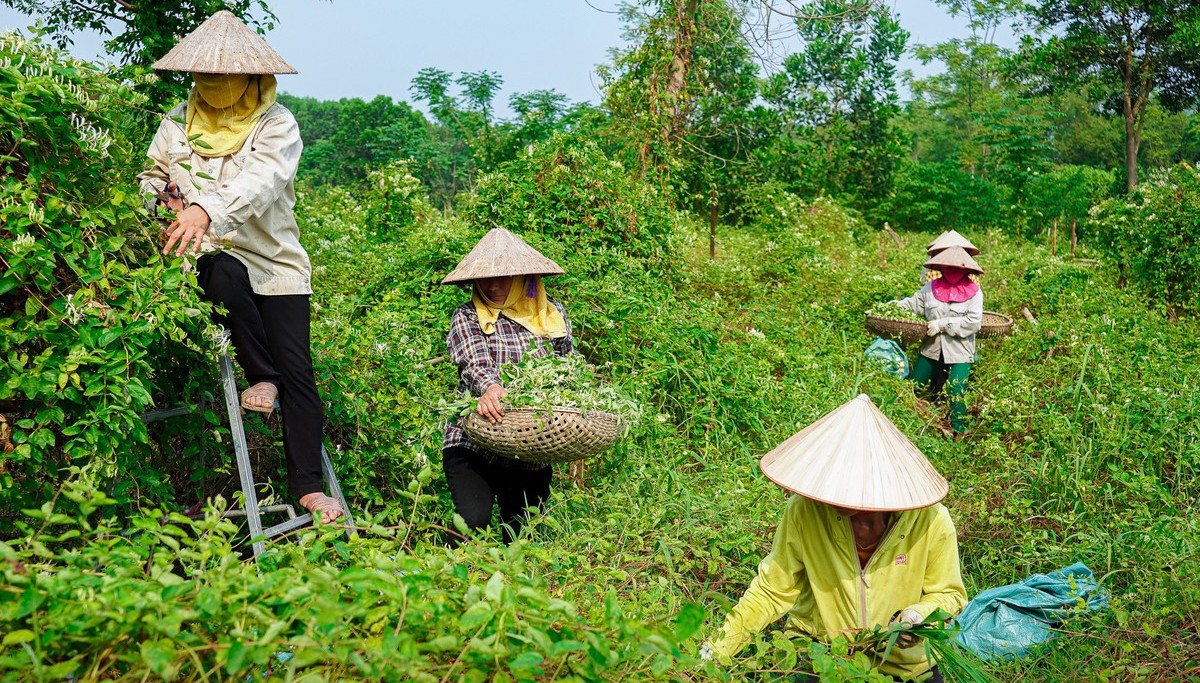 Công nhân của HTX hái thảo dược trên núi Bái Đính. Hiện nay HTX Sinh Dược đang tạo việc làm cho 60 người lao động có thu nhập ổn định