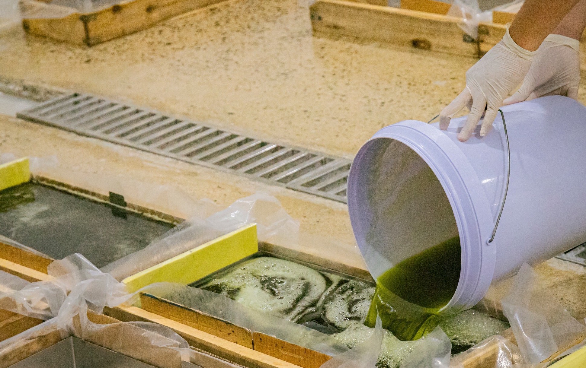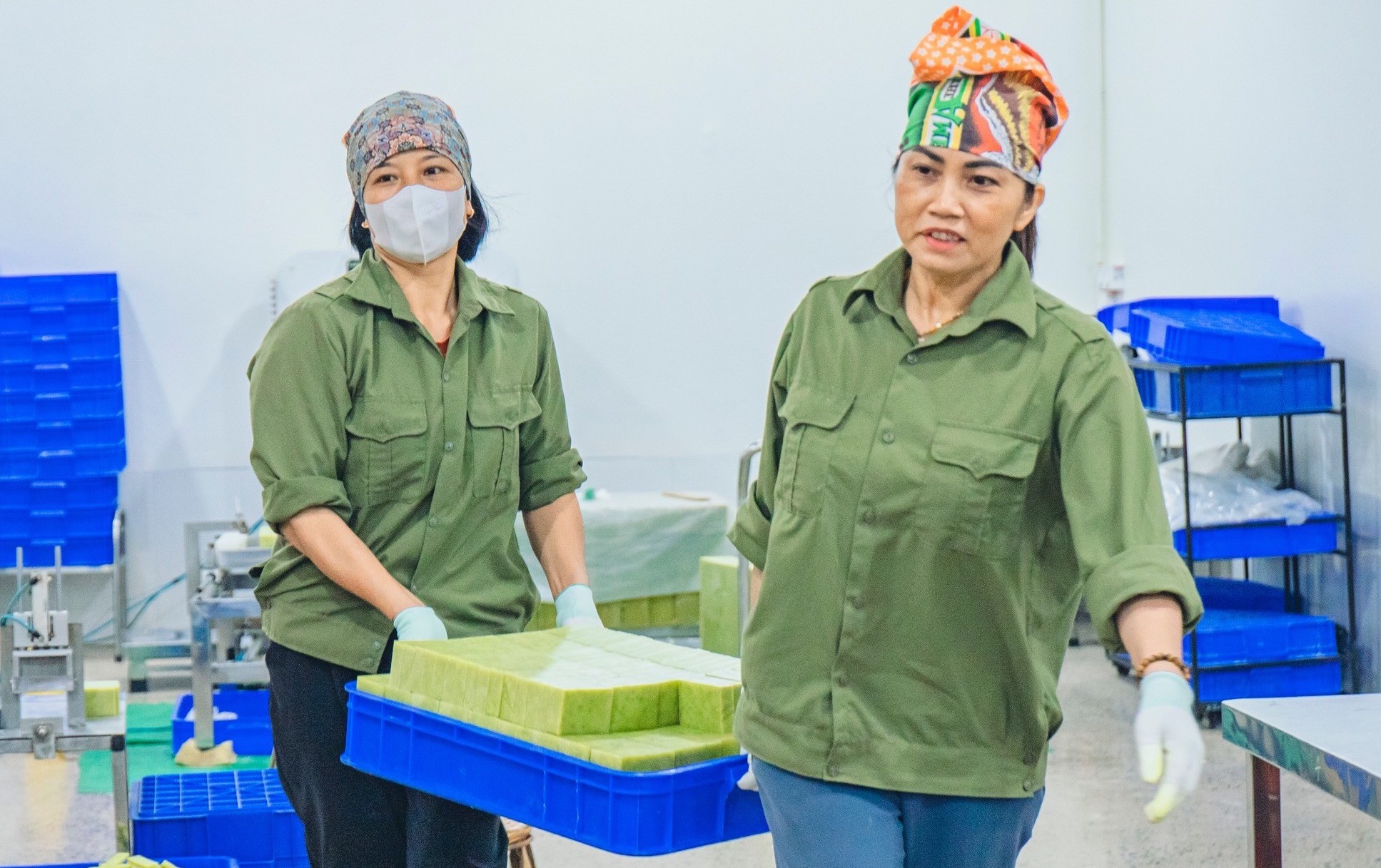 Công nhân HTX Sinh Dược mang những bánh xà phòng đã được cắt vuông vắn để chuẩn bị cho bước đóng gói
