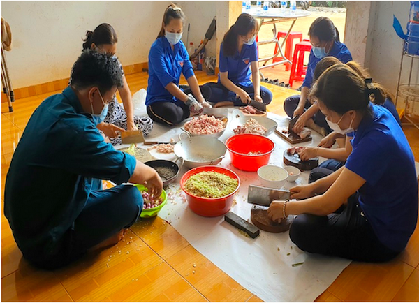 Thanh niên huyện Lộc Ninh cùng sơ chế các nguyên liệu cần thiết để làm món mắm ruốc xào thịt