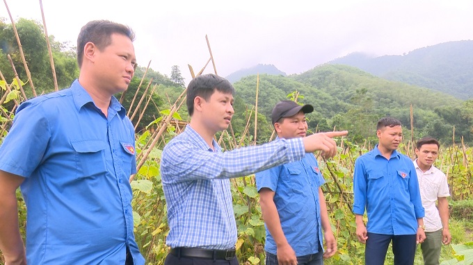 Đoàn viên thanh niên Triệu Quốc Tuấn (áo kẻ) đã từng bước khẳng định những nỗ lực của bản thân trong việc làm giàu trên mảnh đất quê hương từ mô hình trồng dưa chuột lai.