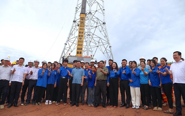 Thủ tướng Phạm Minh Chính động viên thanh niên trên công trường dự án đường dây tải điện 500kV mạch 3 Quảng Trạch-Phố Nối đoạn qua tỉnh Nghệ An.