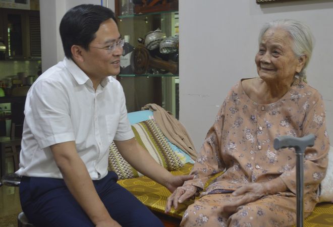 Bí thư thứ nhất Trung ương Đoàn Nguyễn Anh Tuấn thăm hỏi, chúc tết bà Lê Thị Huệ, cán bộ lão thành cách mạng ở P.Hòa Thuận, TP.Cao Lãnh, Đồng Tháp. Ảnh: Trần Ngọc