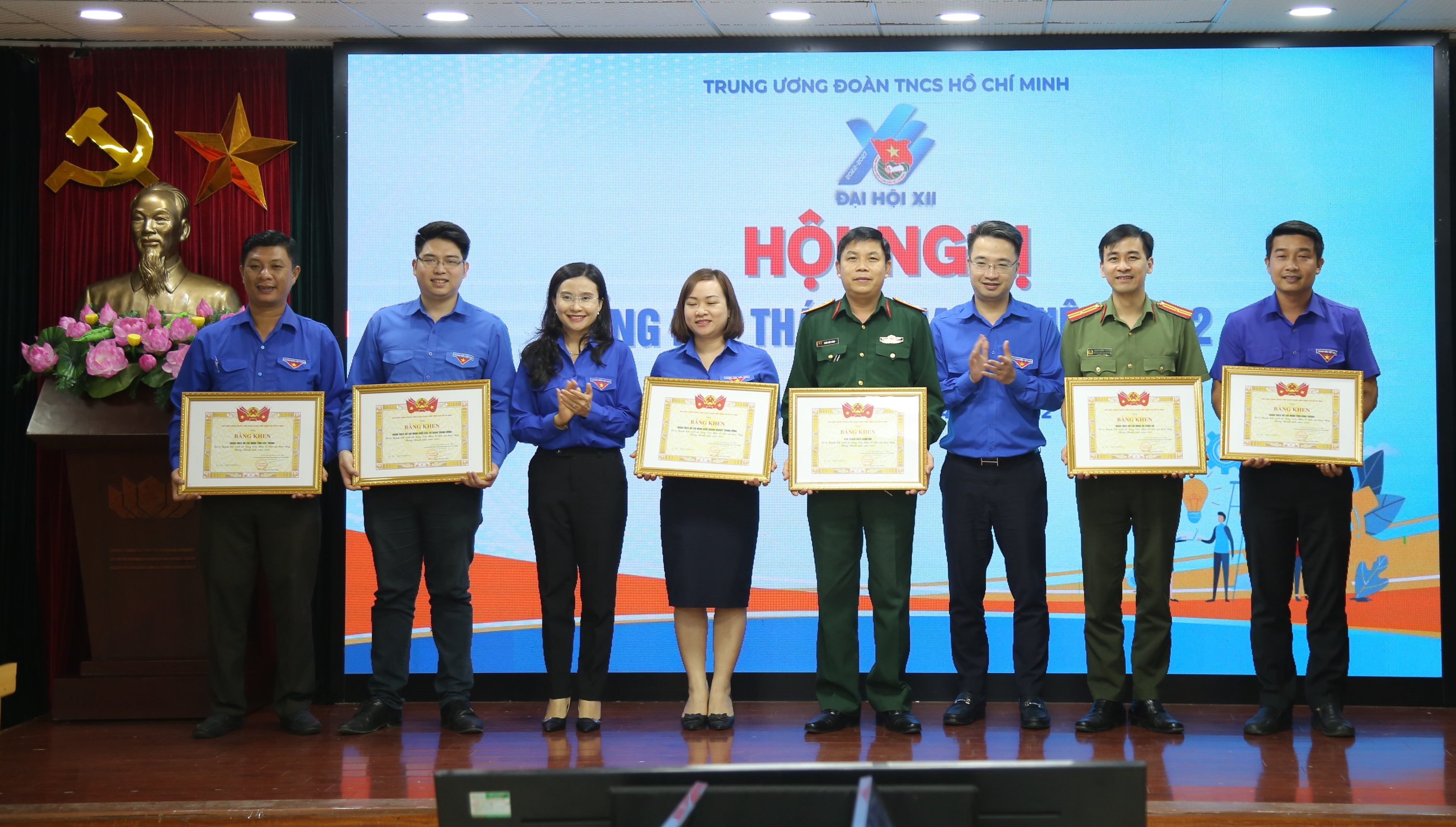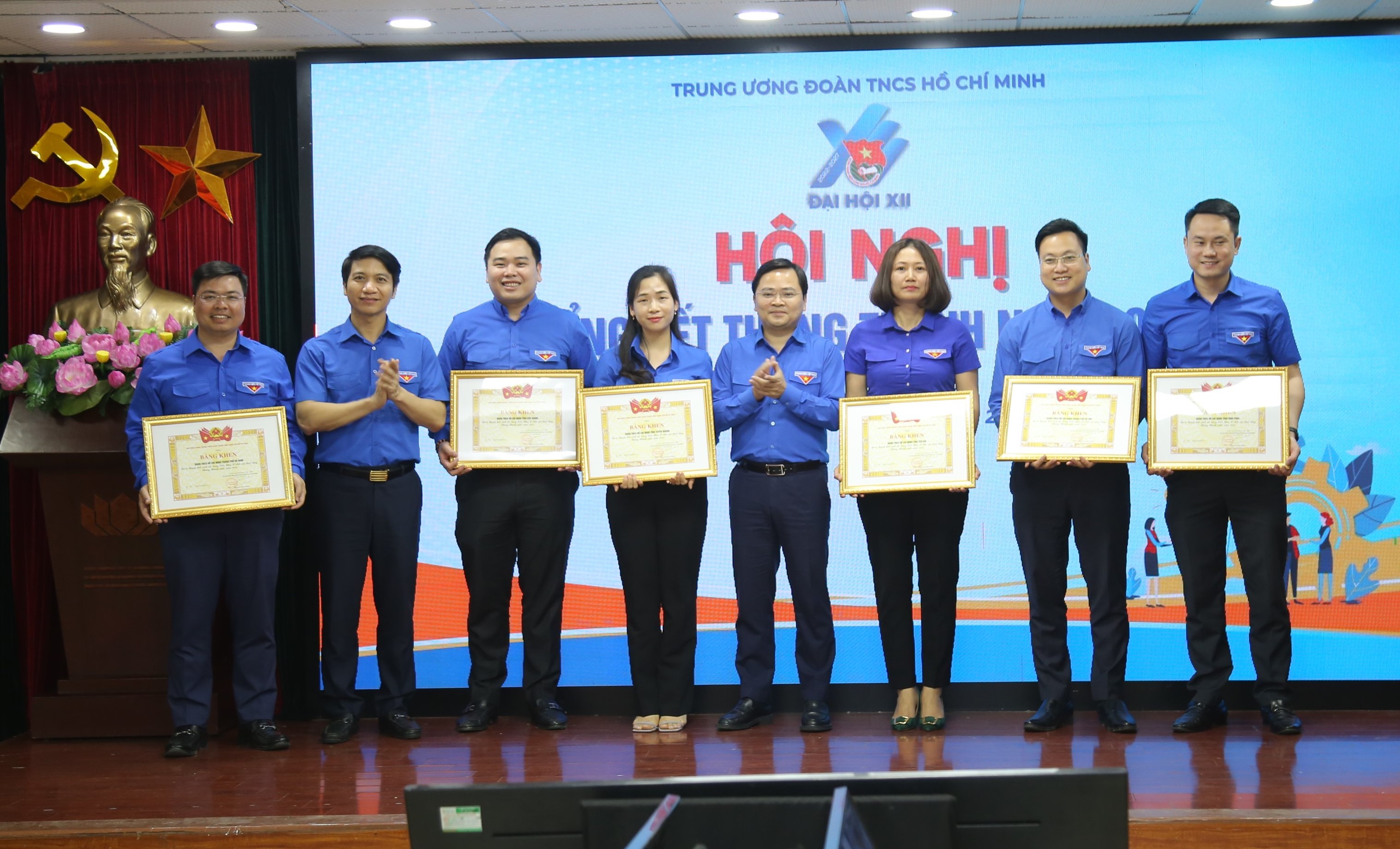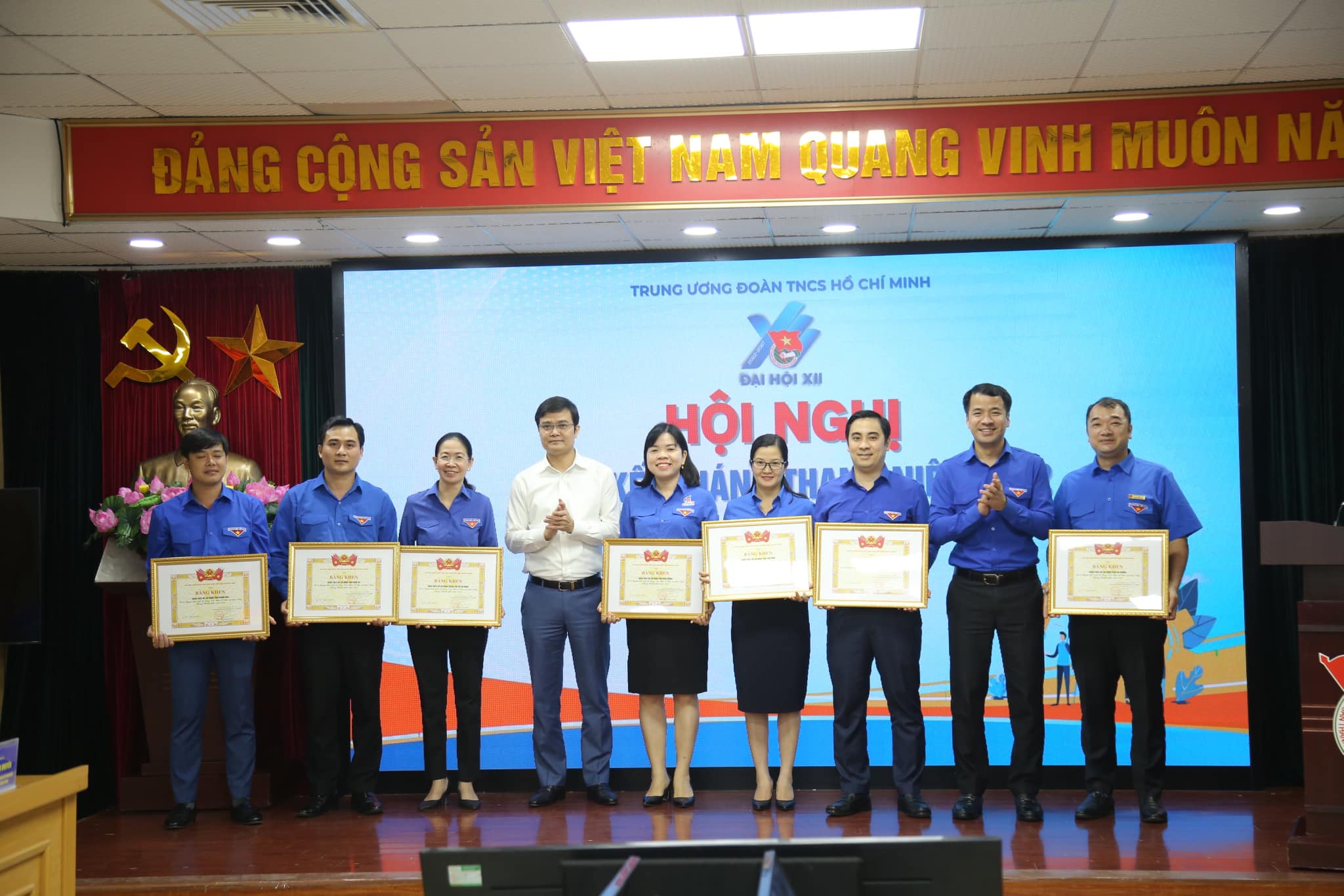 Đồng chí Nguyễn Anh Tuấn - Ủy viên T.Ư Đảng, Bí thư thứ nhất Trung ương Đoàn và đồng chí Nguyễn Ngọc Lương- Bí thư Trung ương Đoàn, Chủ tịch Hội LHTN Việt Nam tặng Bằng khen cho các đơn vị có thành tích xuất sắc trong Tháng thanh niên năm 2022