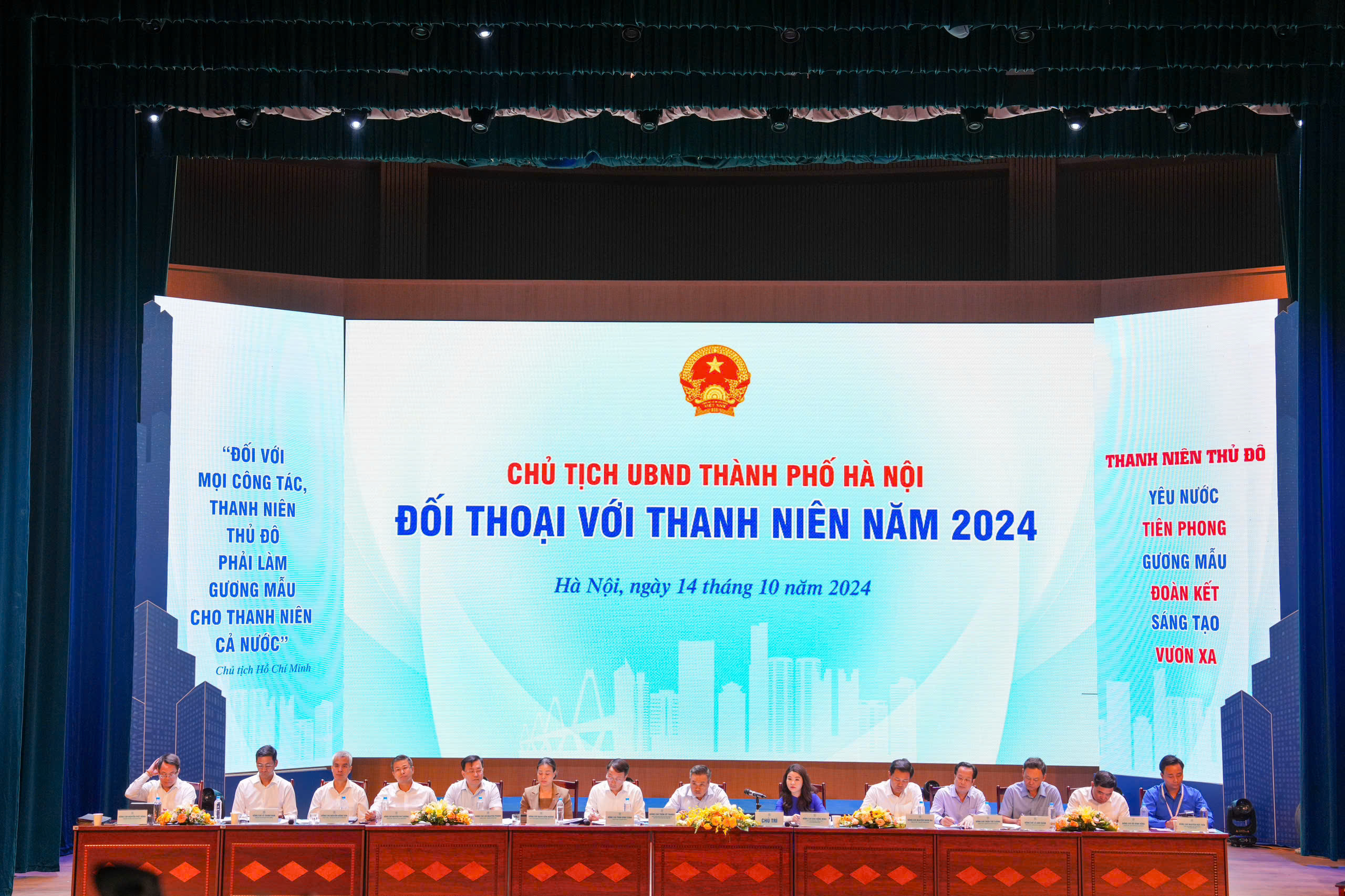 Tại hội nghị đối thoại, Chủ tịch UBND TP Hà Nội cùng với các đồng chí lãnh đạo Sở Nội vụ, Thành đoàn, Sở Văn hóa, Sở Kế hoạch và Đầu tư, Sở Giao thông và Vận tải, Sở Giáo dục và Đào tạo, Sở Khoa học và Công nghệ, Sở Thông tin và Truyền thông, Sở Xây dựng, Sở Nông nghiệp và Phát triển nông thôn, Sở Du lịch, Sở Lao động - Thương binh và Xã hội, Sở Công thương Hà Nội trao đổi, thông tin, giải đáp những ý kiến và nguyện vọng của đoàn viên, thanh niên Thủ đô 3 nhóm vấn đề.