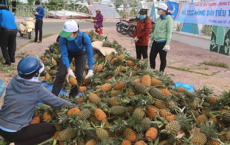 Tại thành phố Mỹ Tho, Ban Thường vụ Tỉnh Đoàn tổ chức Chương trình “San sẻ yêu thương, chung tay vượt qua đại dịch”, hỗ trợ nông dân huyện Tân Phước tiêu thụ nông sản bị dồn ứ do ảnh hưởng của dịch bệnh Covid-19, thu hút sự ủng hộ của đông đảo người dân. Trong ngày 11/6/2021, chương trình đã hỗ trợ người dân tiêu thụ 8 tấn khóm, trong những ngày tiếp theo, thực hiện nghiêm chỉ đạo của UBND tỉnh về giãn cách xã hội theo Chỉ thị số 15/CT-TTg ngày 27/3/2020 của Thủ tướng chính phủ trên địa bàn tỉnh Tiền Giang, chương trình chuyển đổi hình thức sang bán hàng trực tuyến, giao tận nơi.