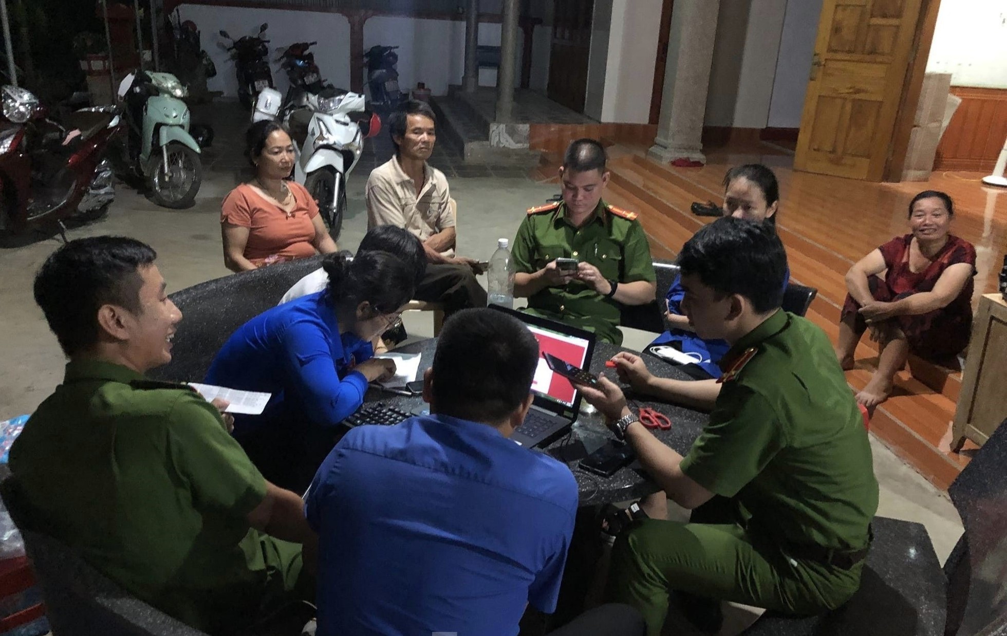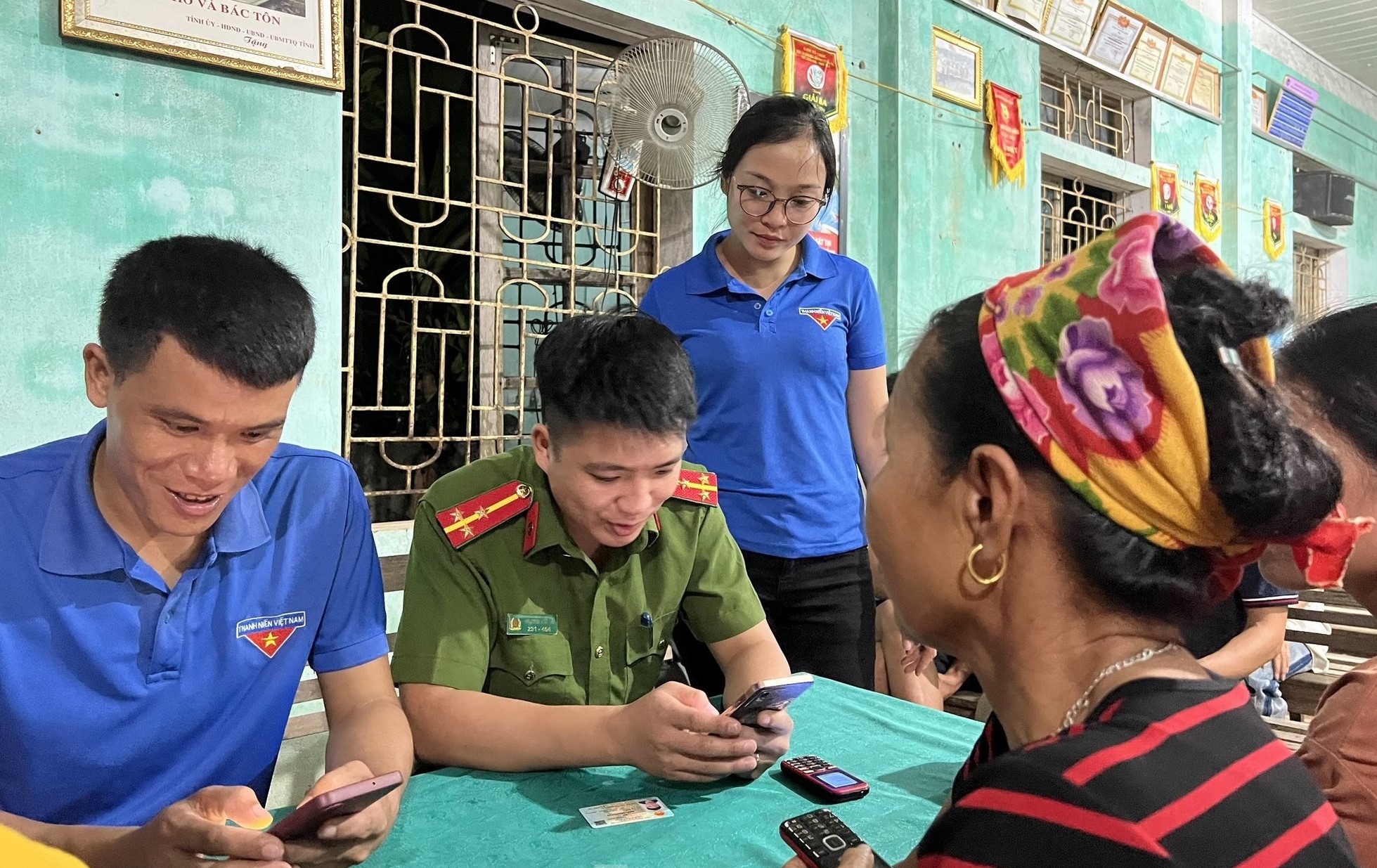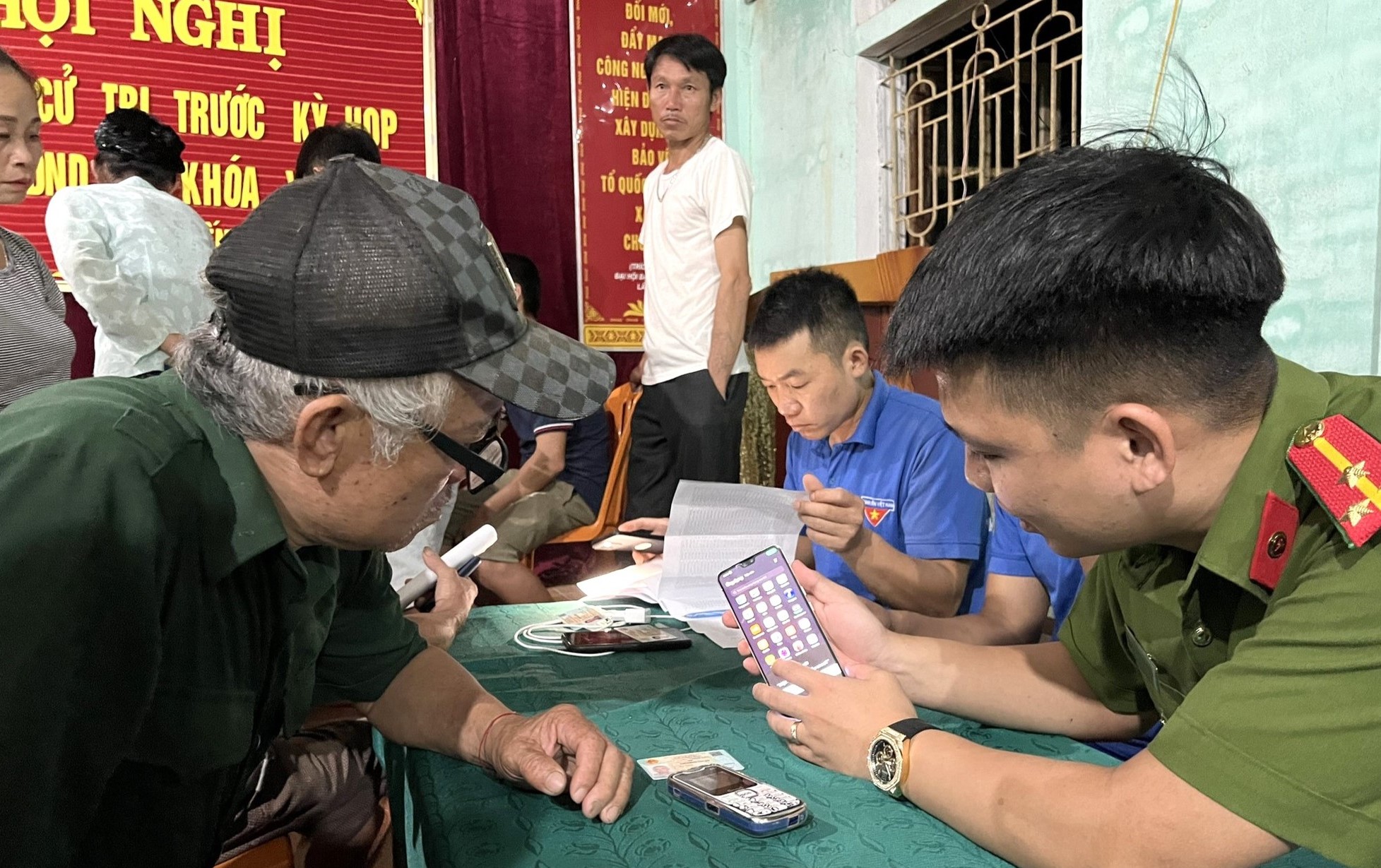 Về đêm, các cán bộ, chiến sĩ công an, đoàn viên thanh niên vẫn miệt mài hướng dẫn tận tình cho người dân cài đặt, kích hoạt, sử dụng tài khoản định danh điện tử.