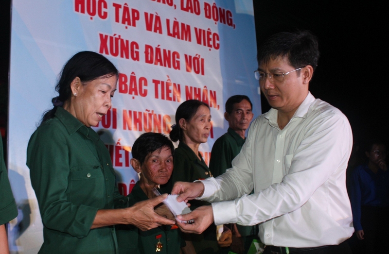 Đồng chí Nguyễn Thành Tâm - Ủy viên T.Ư Đảng, Bí thư Tỉnh uỷ, Chủ tịch HĐND tỉnh Tây Ninh và đồng chí Nguyễn Tường Lâm - Bí thư T.Ư Đoàn tặng quà cho các cựu bộ đội tỉnh Tây Ninh.