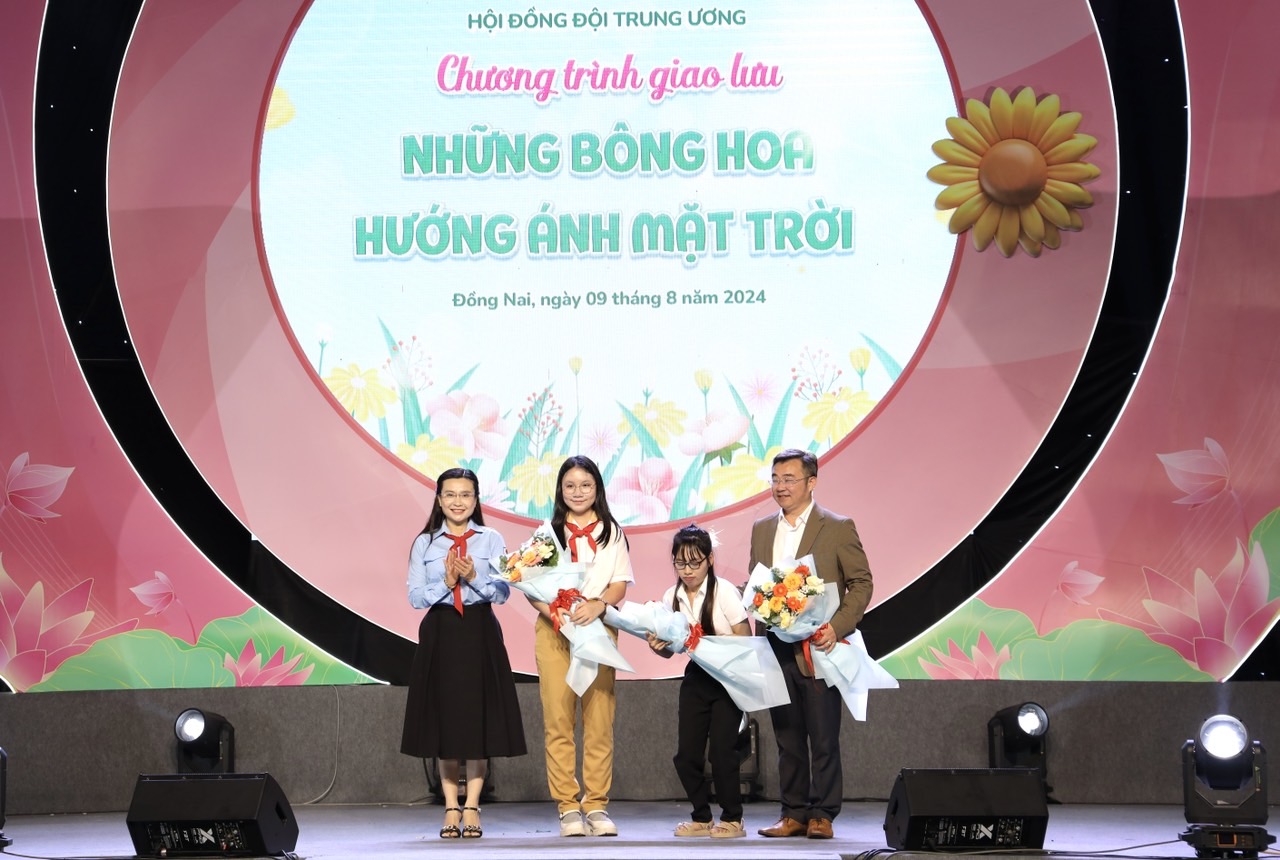 Đồng chí Nguyễn Phạm Duy Trang - Bí thư T.Ư Đoàn, Chủ tịch Hội đồng Đội T.Ư tặng hoa cho các đại biểu tham gia giao lưu trong chương trình