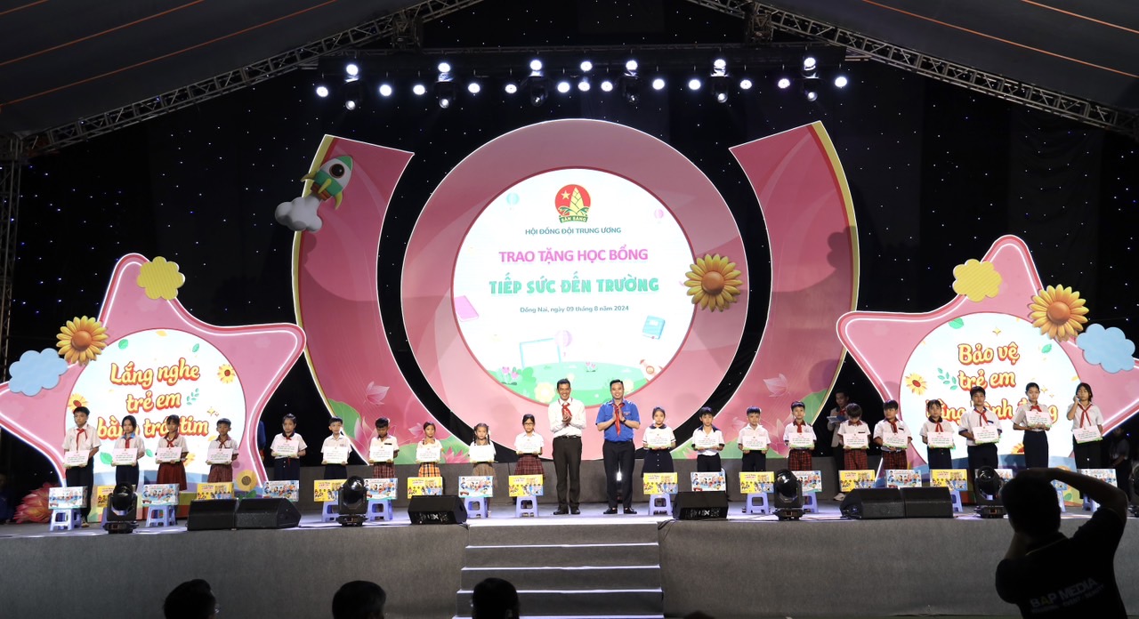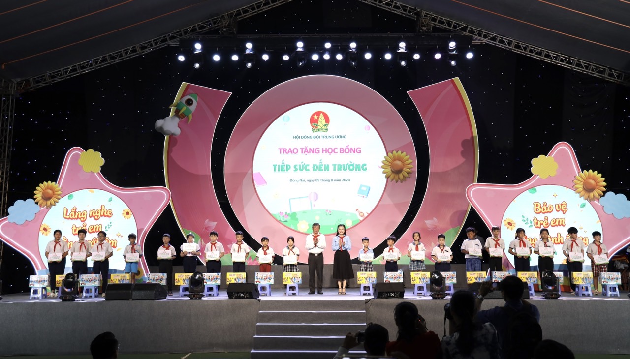 Để đồng hành với các em bước vào năm học mới 2024 - 2025, tại chương trình, Hội đồng Đội Trung ương và các đơn vị đồng hành trao tặng 100 suất học bổng “Tiếp sức cho em đến trường” (01triệu đồng/suất) cùng quà tặng (01 thùng sữa LOF và bộ dụng cụ học tập) và 50 suất học bổng “Cặp nến yêu thương”, (2,4 triệu đồng/suất) cho các em thiếu nhi có hoàn cảnh khó khăn của tỉnh Đồng Nai./.