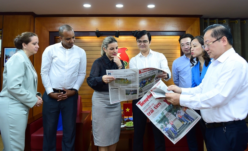 Hai bên trao đổi về các bài viết về hoạt động của đoàn đại biểu Đoàn TNCS Hồ Chí Minh làm việc tại Cuba dịp tháng 4/2023 trên Báo Tiền Phong (ảnh: Xuân Tùng)