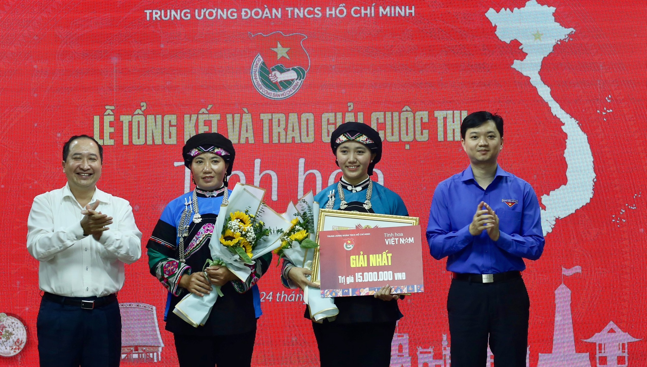 Đồng chí Nguyễn Minh Triết, Bí thư TƯ Đoàn, Chủ tịch Hội SVVN và đồng chí Vy Tư Liệu, Vụ trưởng Vụ Đoàn thể nhân dân, Ban Dân vận Trung ương trao Giải Nhất cho thí sinh Lồ Phà Tú Anh , trường THPT Số 1 huyện Mường Khương, tỉnh Lào Cai, với tác phẩm: “Trang phục truyền thống của người Bố Y”