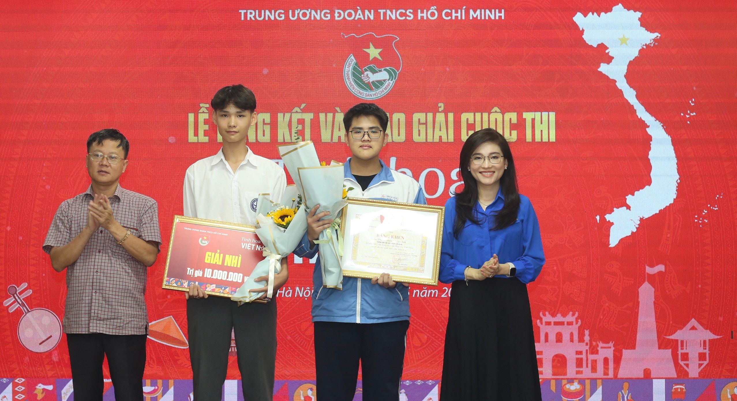 Đồng chí Trần Văn Đạt, Vụ trưởng Vụ Giáo dục Chính trị và Công tác học sinh, sinh viên, Bộ Giáo dục và Đào tạo và đồng chí Nguyễn Thái An, Ủy viên BTV, Trưởng Ban Tuyên giáo T.Ư Đoàn trao Giải Ba cho thí sinh