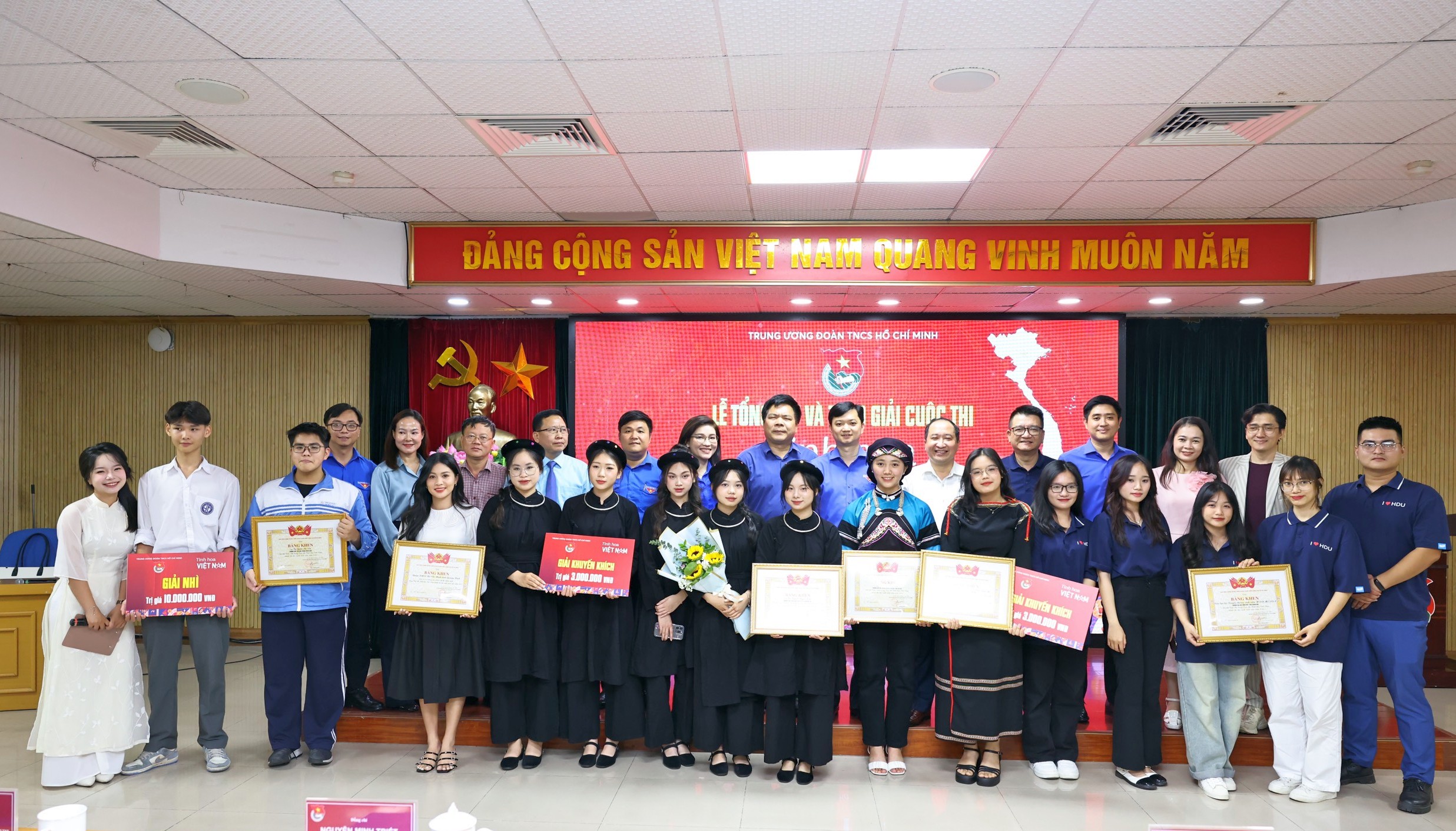Đồng chí Đinh Xuân Thắng, Phó Vụ trưởng Vụ Tuyên truyền, Ủy ban Dân tộc và đồng chí Lâm Tùng, Phó Trưởng Ban Thanh niên Trường học trao giải khuyến khích cho thí sinh đạt giải