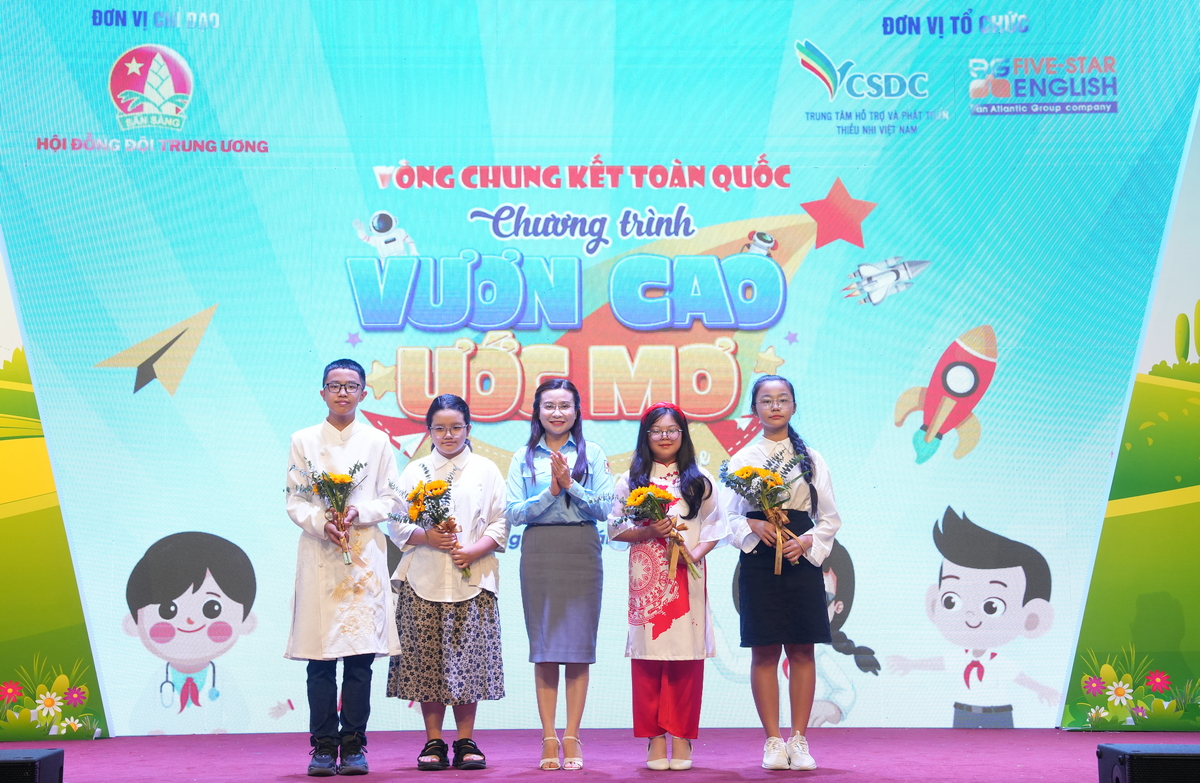 Đồng chí Nguyễn Phạm Duy Trang, Bí thư T.Ư Đoàn, Chủ tịch Hội đồng Đội T.Ư tặng hoa chúc mừng 04 em được vào vòng chung kết Chương trình "Vươn cao ước mơ"