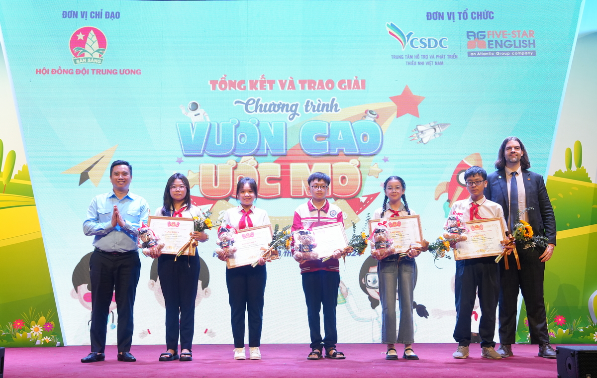 Đồng chí Lê Anh Quân - Phó Chủ tịch Hội đồng Đội T.Ư, Giám đốc Trung tâm Hỗ trợ và Phát triển Thiếu nhi Việt Nam và đại diện Tập đoàn Giáo dục Atlantic trao giải Ba cho các em