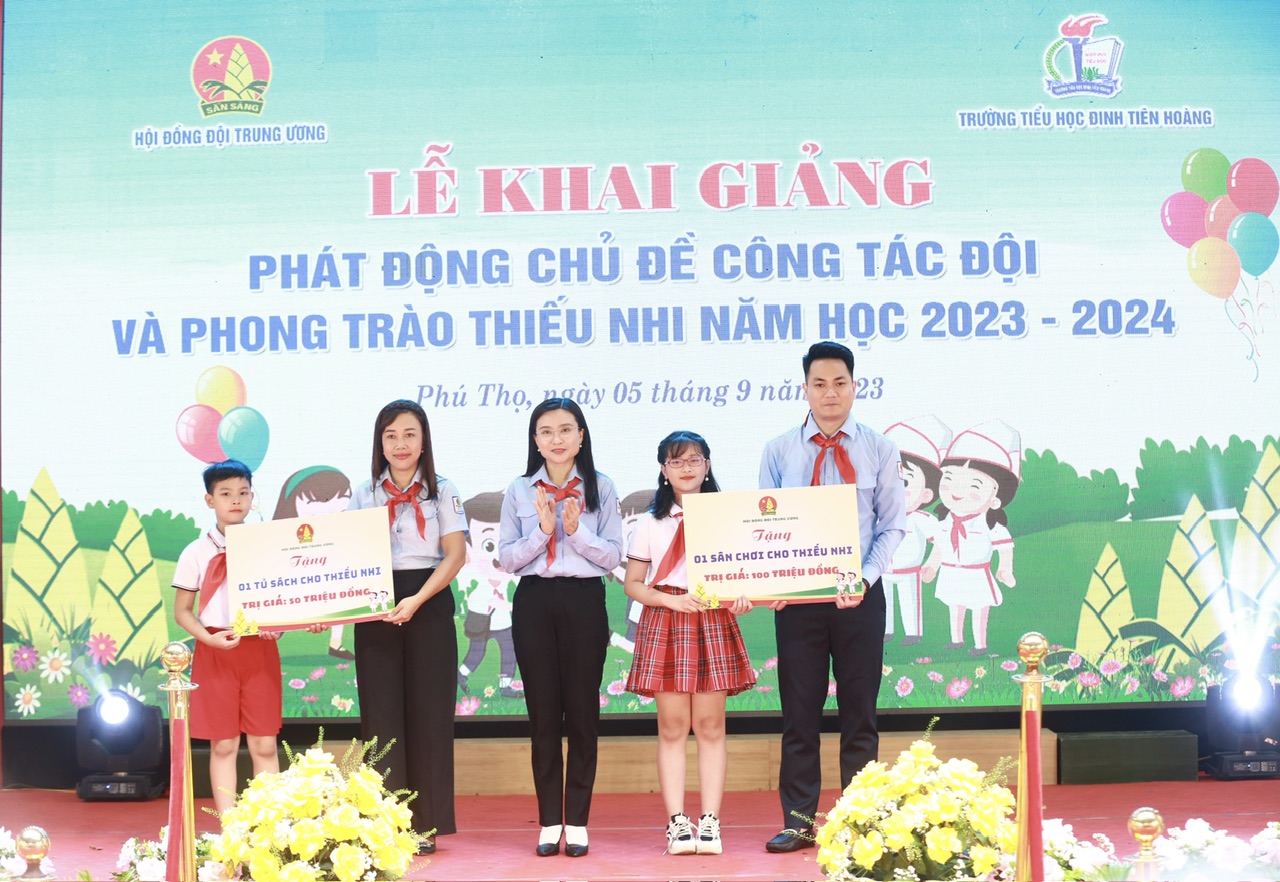 Tại chương trình Hội đồng Đội Trung ương đã trao tặng 1 sân chơi thiếu nhi trị giá 100 triệu đồng cho thiếu nhi tỉnh Phú Thọ; 1 tủ sách thiếu nhi trị giá 50 triệu đồng cho Liên đội Trường tiểu học Đinh Tiên Hoàng; trao 40 suất học bổng cho 40 học sinh có hoàn cảnh khó khăn của nhà trường./.