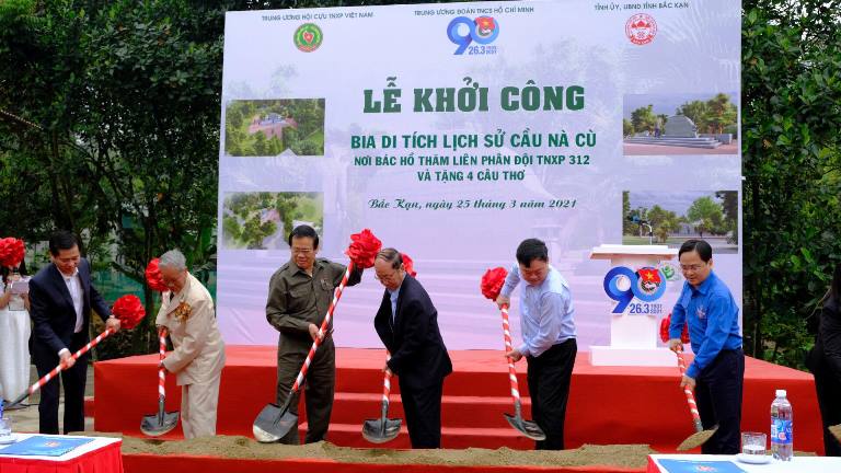 Khởi công xây dựng bia đá nơi Bác Hồ tới thăm Liên đội TNXP 312 và tặng thơ Thanh niên xung phong bên bờ nam Cầu Nà Cù, xã Cẩm Giàng, huyện Bạch Thông