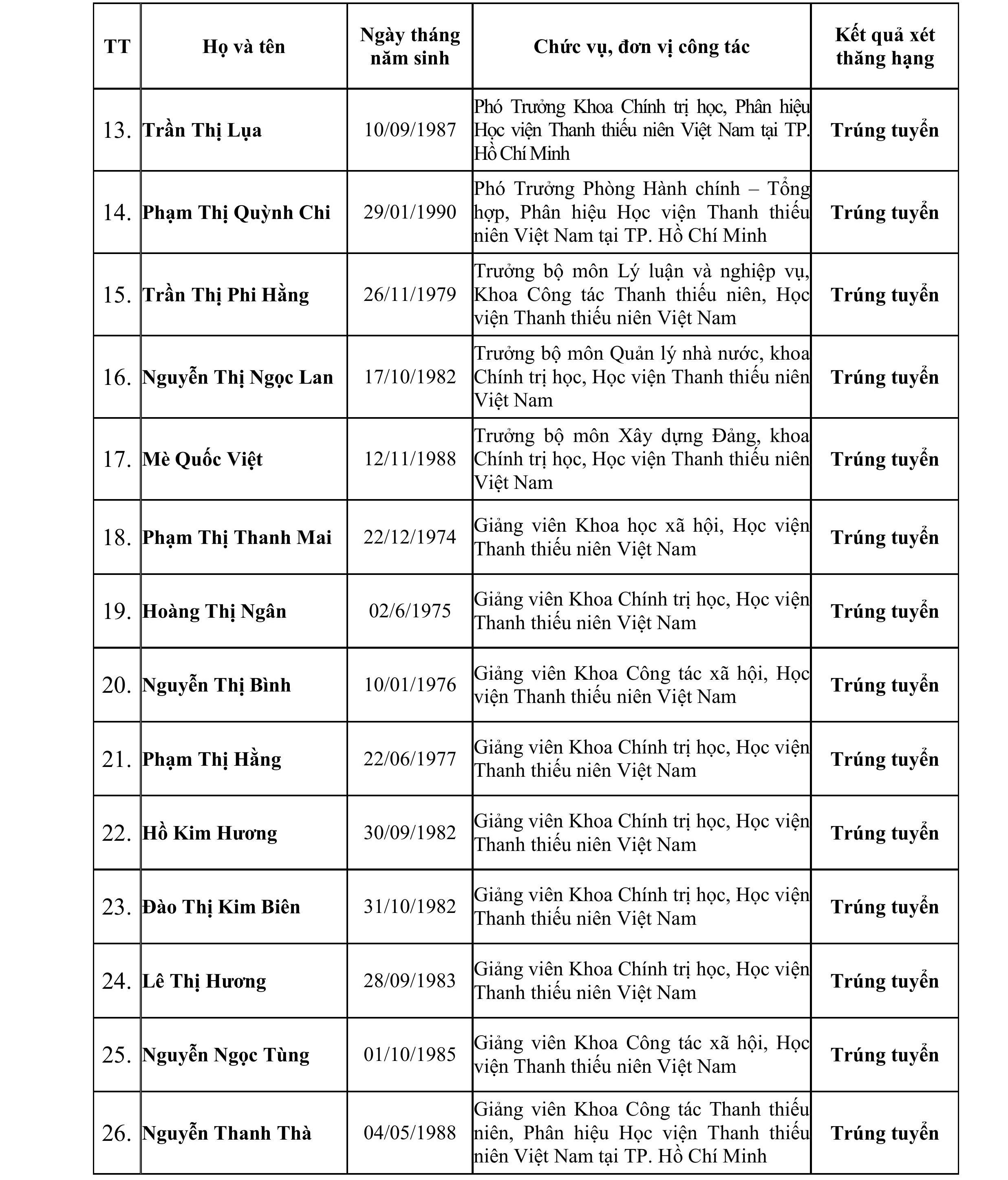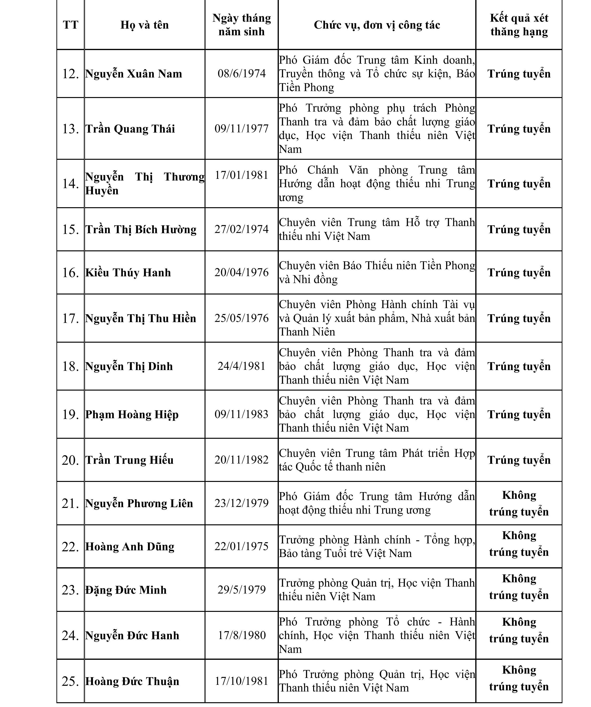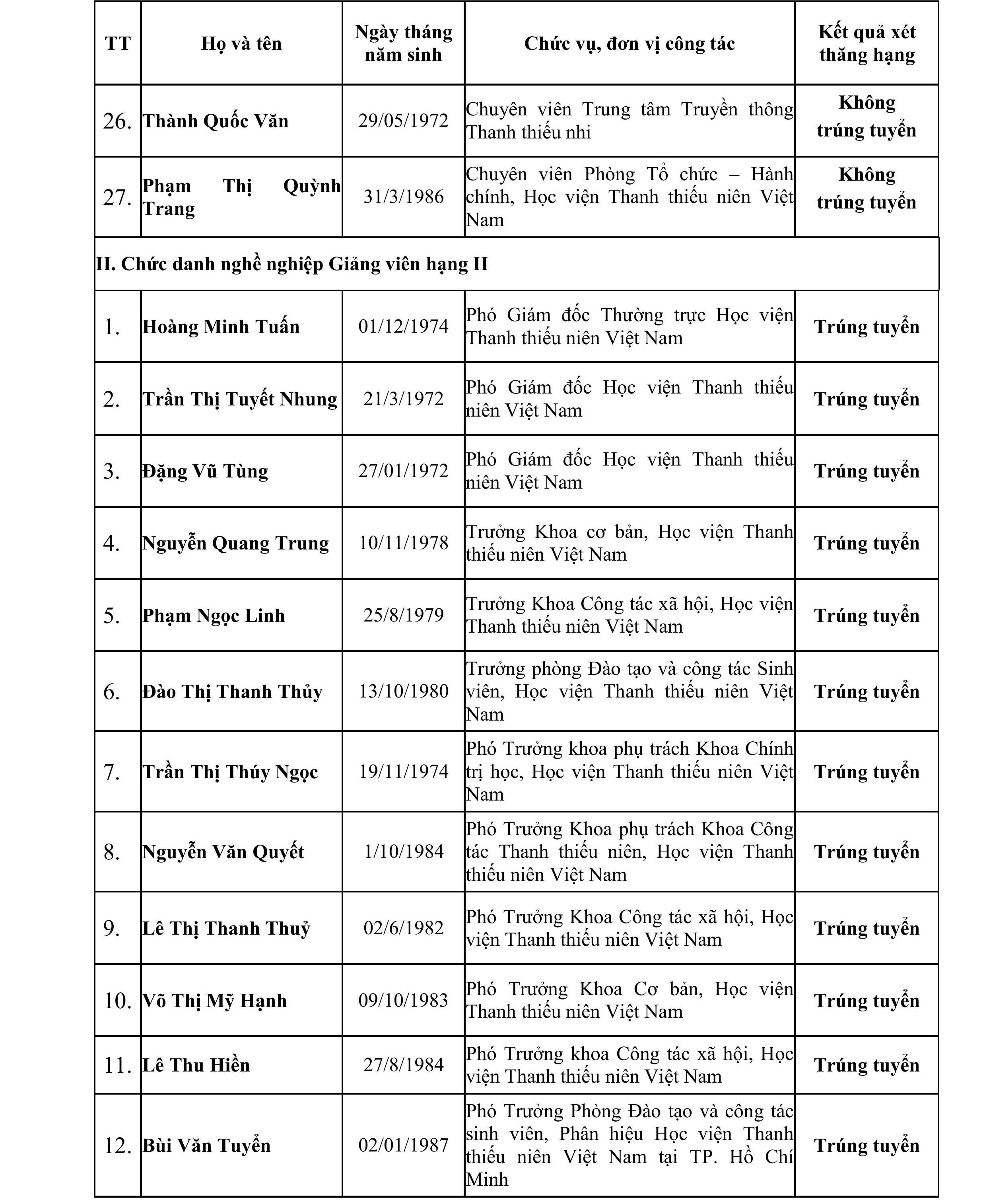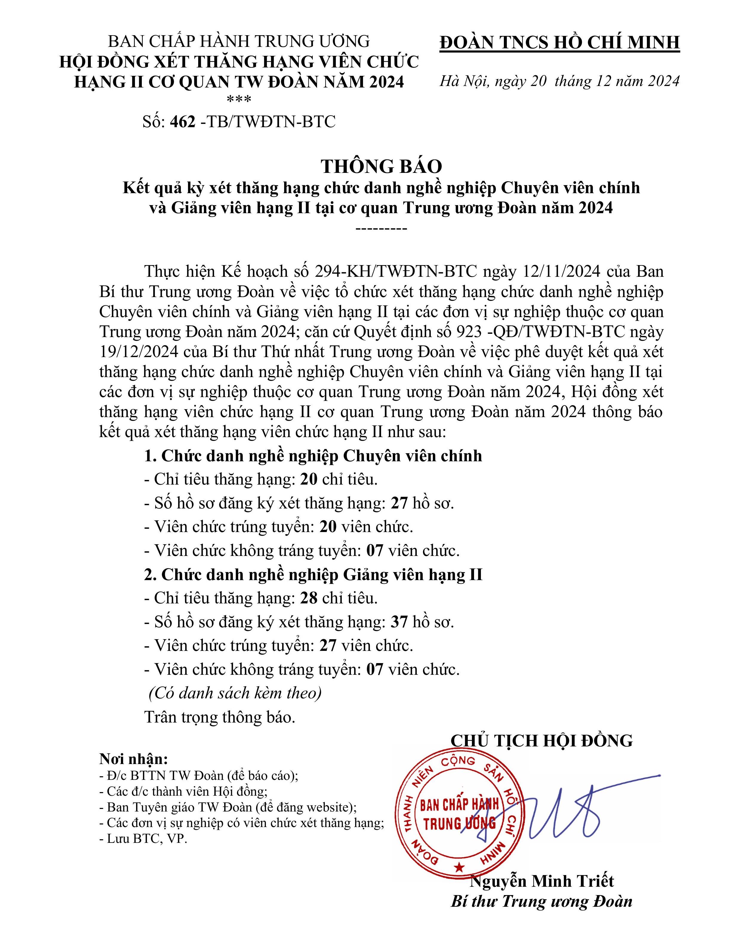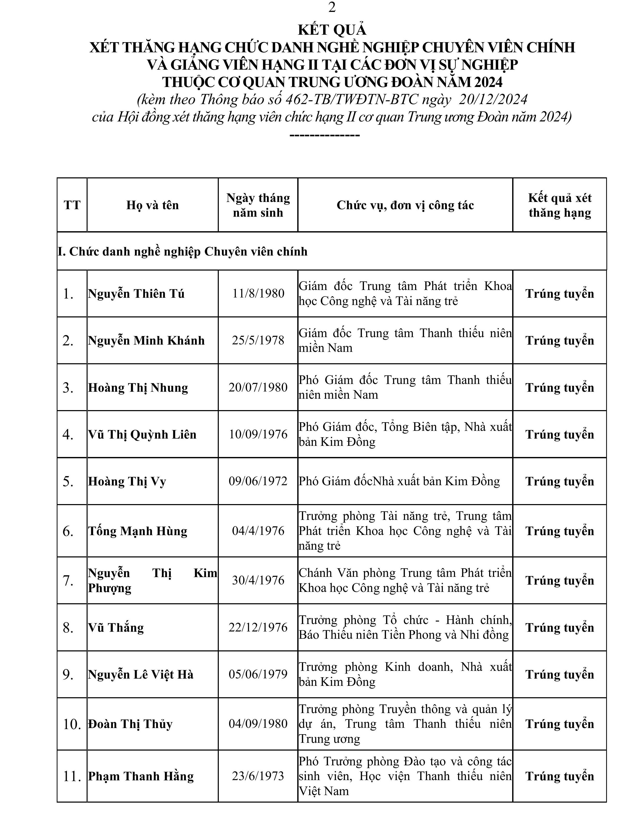Căn cứ Quyết định số 923 -QĐ/TWĐTN-BTC ngày 19/12/2024 của Bí thư Thứ nhất Trung ương Đoàn về việc phê duyệt kết quả xét thăng hạng chức danh nghề nghiệp Chuyên viên chính và Giảng viên hạng II tại các đơn vị sự nghiệp thuộc cơ quan Trung ương Đoàn năm 2024, Hội đồng xét thăng hạng viên chức hạng II cơ quan Trung ương Đoàn năm 2024 thông báo kết quả xét thăng hạng viên chức hạng II như sau: