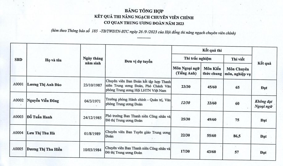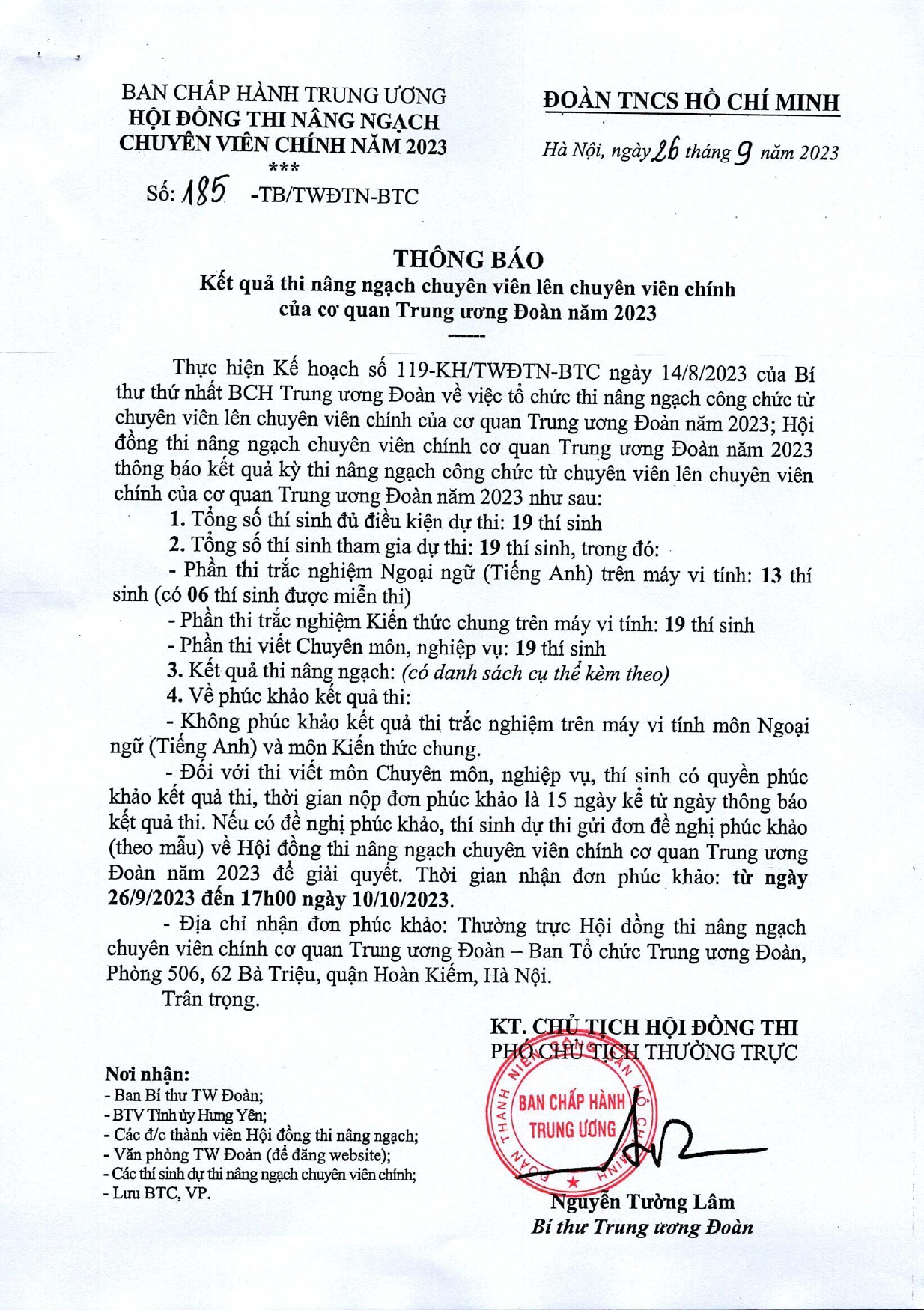 Nếu có đề nghị phúc khảo, thí sinh dự thi gửi đơn đề nghị phúc khảo (theo mẫu tải tại đây) về hội đồng thi nâng ngạch chuyên viên chính cơ quan Trung ương Đoàn năm 2023 để giải quyết. Thời gian nhận đơn phúc khảo từ ngày 26/9/2023 đến 17h00 ngày 10/10.
