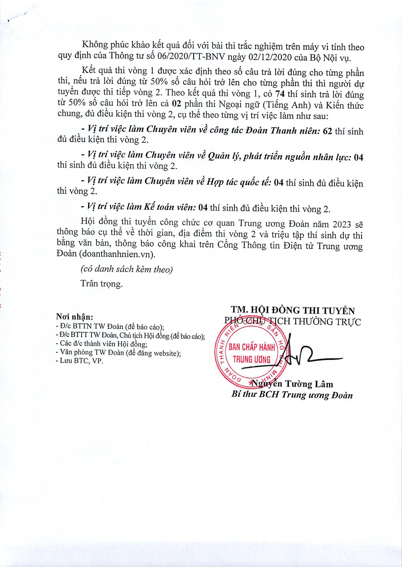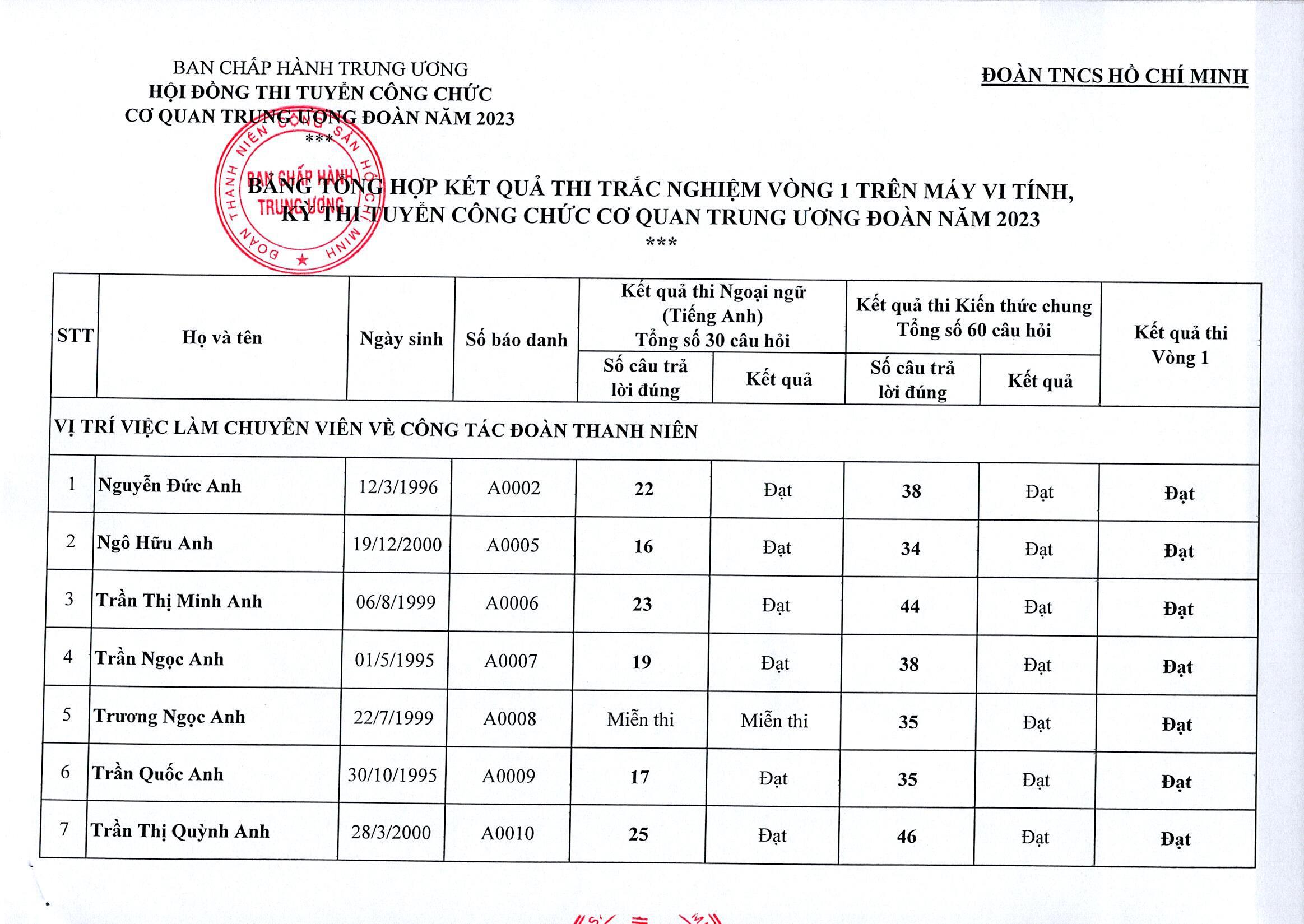 Thông báo kết quả thi trắc nghiệm vòng 1 trên máy vi tính kỳ thi tuyển công chức cơ quan TW Đoàn năm 2023. Xem toàn bộ tại đây