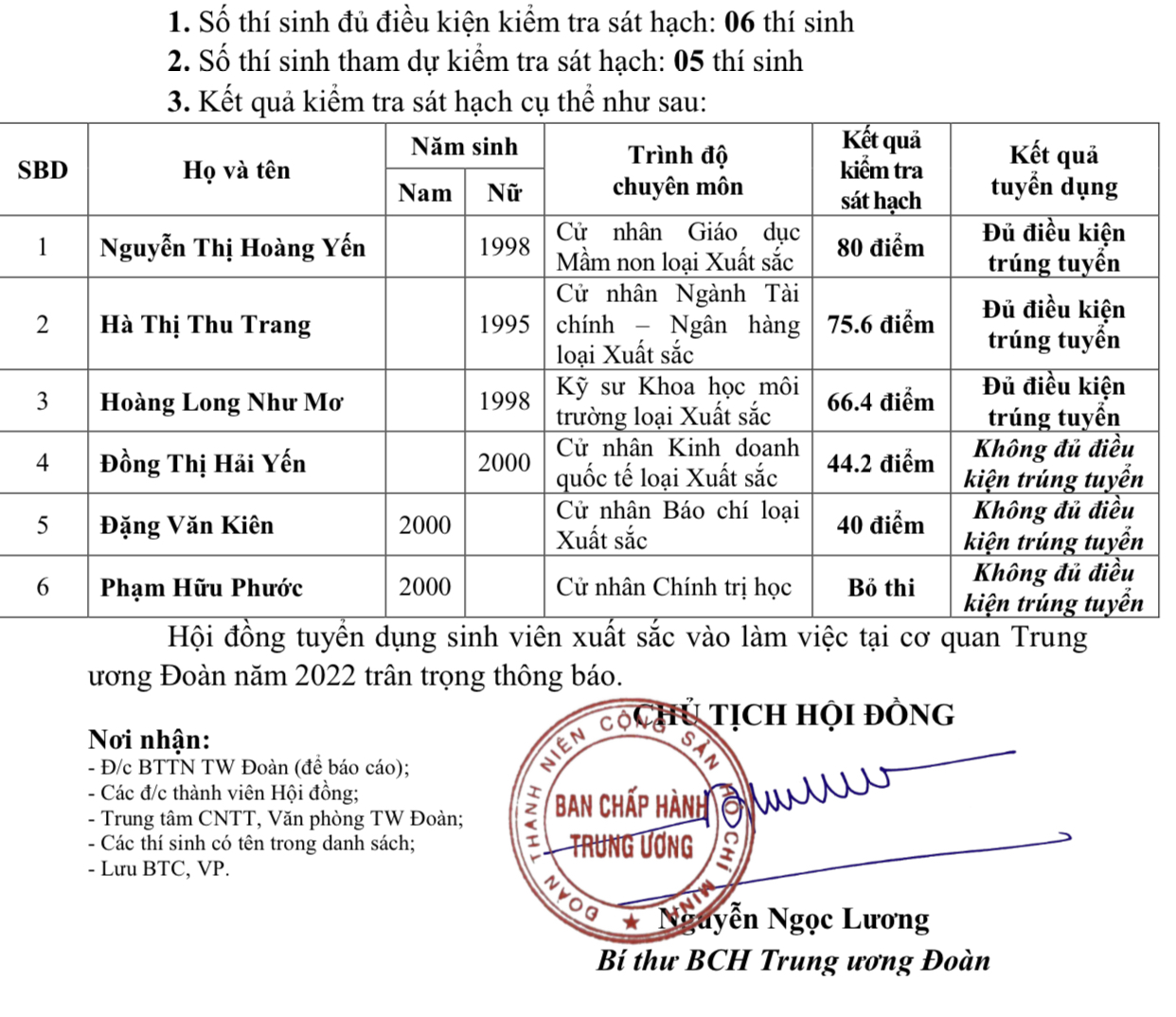 ĐTN: Căn cứ Kế hoạch số 543-KH/TWĐTN-BTC ngày 30/6/2022 của Bí thư Thứ nhất BCH Trung ương Đoàn về việc tuyển dụng sinh viên tốt nghiệp xuất sắc vào làm việc tại cơ quan Trung ương Đoàn; Quyết định số 2677- QĐ/TWĐTN-BTC ngày 26/9/2022 của Bí thư Thứ nhất BCH Trung ương Đoàn về việc phê duyệt kết quả tuyển dụng sinh viên tốt nghiệp xuất sắc vào làm việc tại cơ quan Trung ương Đoàn năm 2022; Hội đồng tuyển dụng sinh viên tốt nghiệp xuất sắc vào làm việc tại cơ quan Trung ương Đoàn năm 2022 thông báo kết quả tuyển dụng như sau: