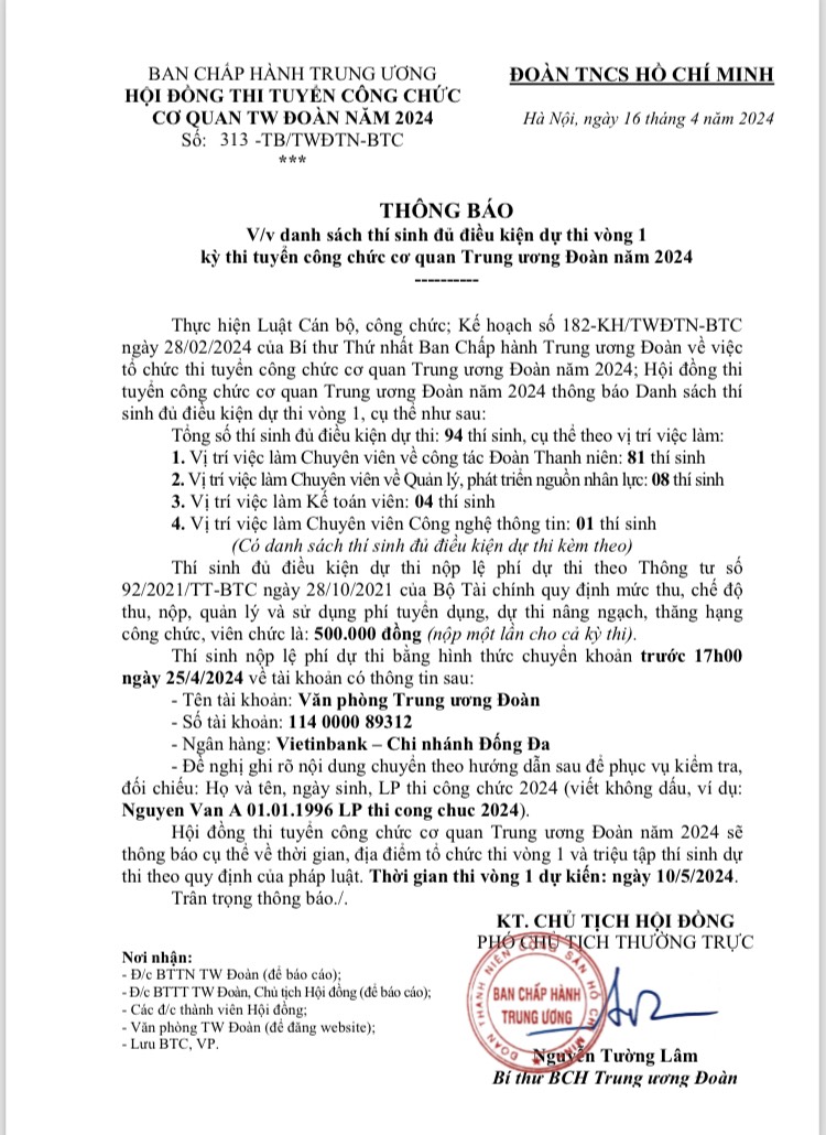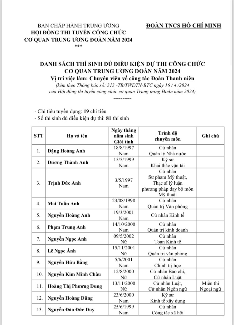 Danh sách thí sinh đủ điều kiện dự thi vòng 1 kỳ thi tuyển công chức cơ quan Trung ương Đoàn năm 2024. Xem tại đây