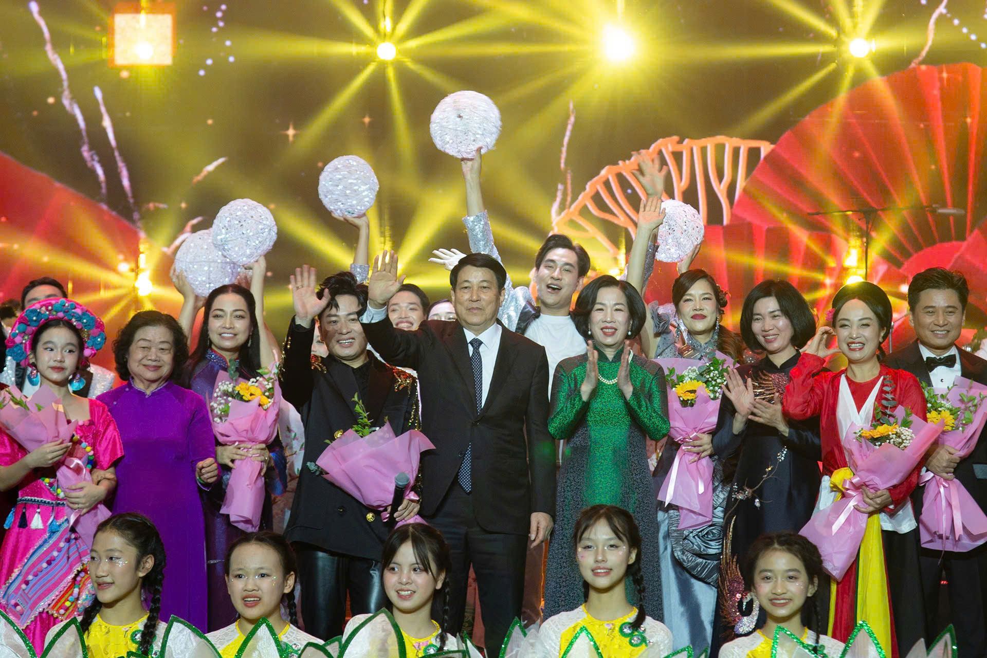 Chủ tịch nước Lương Cường và Phu nhân chúc mừng các nghệ sĩ, kiều bào tham dự Chương trình nghệ thuật "Xuân quê hương 2025". (Ảnh: Thủy Nguyên)