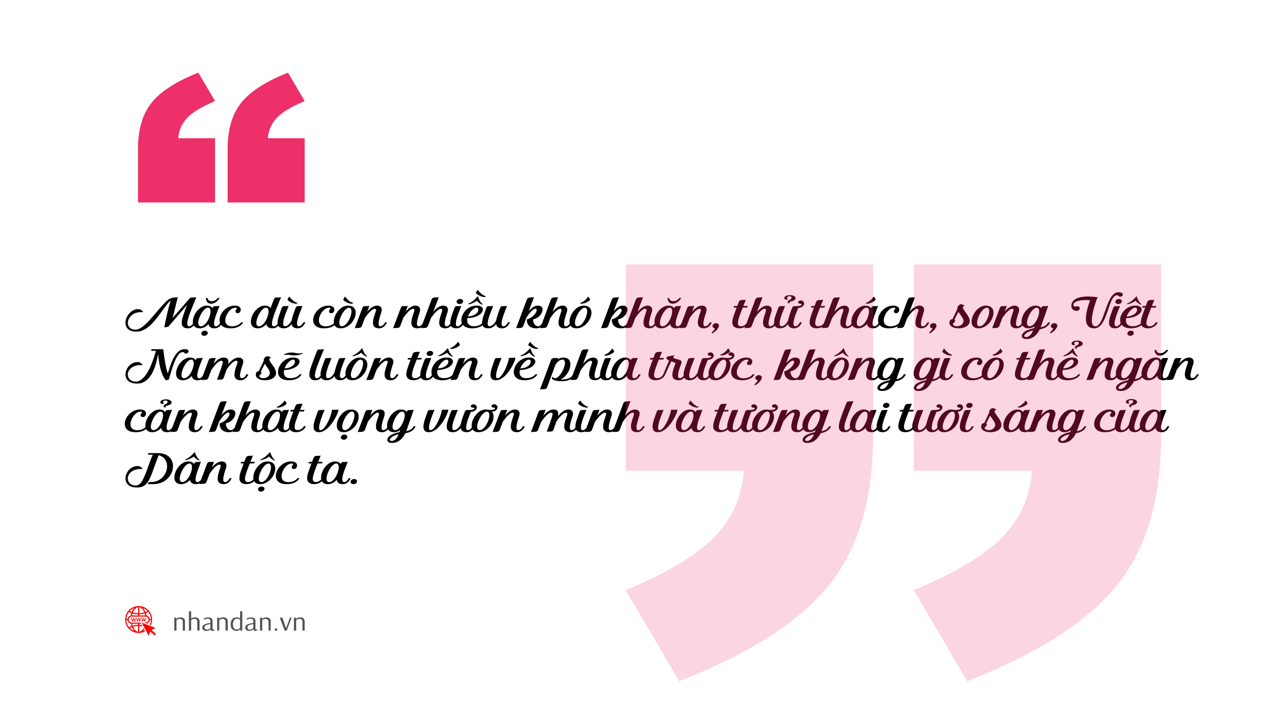 Toàn Đảng, toàn dân, toàn quân tiếp tục đoàn kết một lòng, đồng tâm, hiệp lực, nêu cao tinh thần tự chủ, tự tin, tự lực, tự cường, tự hào dân tộc, tận dụng mọi thời cơ, vượt qua mọi khó khăn, thách thức để phát triển bứt phá, xây dựng nước Việt Nam dân giàu, nước mạnh, dân chủ, công bằng, văn minh; mọi người dân đều có cuộc sống ấm no, tự do, hạnh phúc; đóng góp ngày càng nhiều cho hòa bình, ổn định, phát triển của khu vực và thế giới.