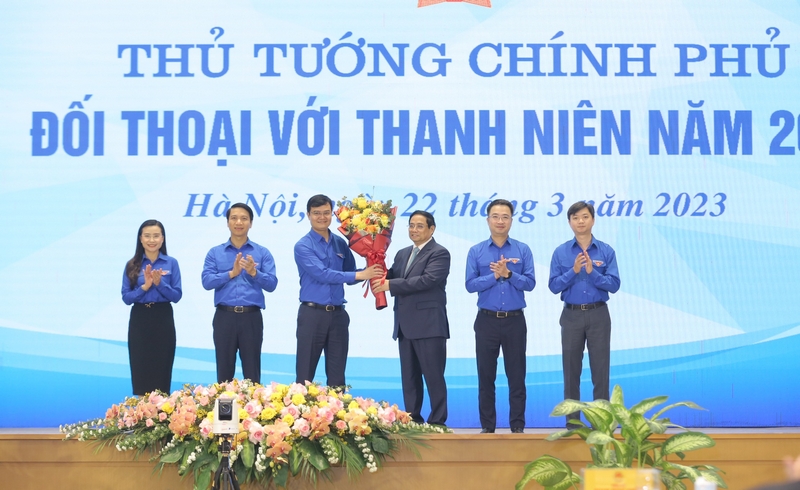 Trước khi bước vào nội dung Đối thoại, Thủ tướng Phạm Minh Chính tặng hoa chúc mừng Đoàn TNCS Hồ Chí Minh; tặng quà cho 10 Gương mặt Trẻ tiêu biểu năm 2022 và 10 Gương mặt Trẻ triển vọng năm 2022.